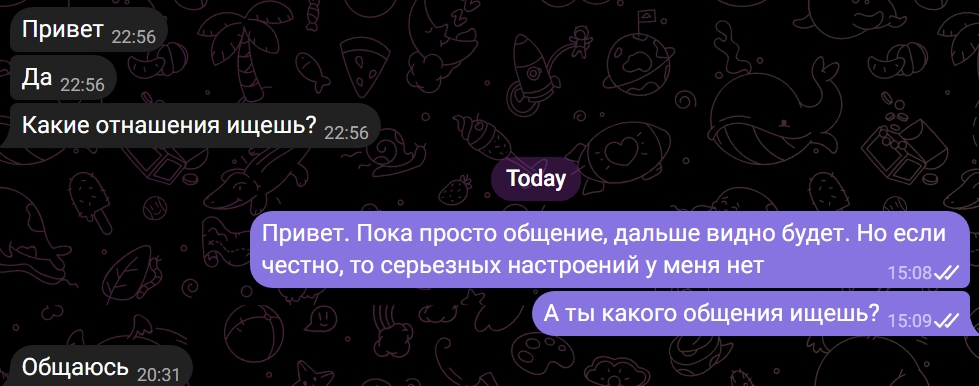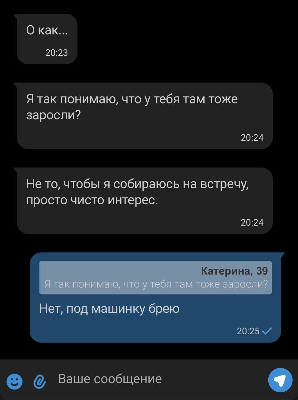 Продолжаю описывать страдания ньюфага на мамбе. Две милфы предложили перейти в тг, перешел, одна написала несколько осмысленных сообщений, я уже обрадовался, а ща вторая пишет почти теми же словами с характерным "Вот и славно", сомневаюсь, что два живых человека могут такое писать за такой короткий промежуток времени. Ну ебана, чертова ботня или разводки, рано обрадовался.