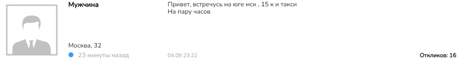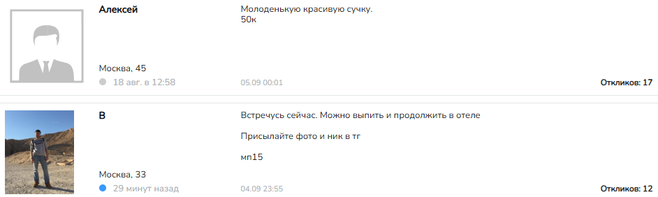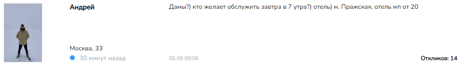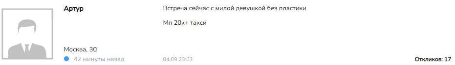 Ну и само собой те у кого плашка "топ" или профи, или с неадекватно ебанутыми запросами в духе "никаких встреч, только АТНАШЕНИ за 500+К/мес...