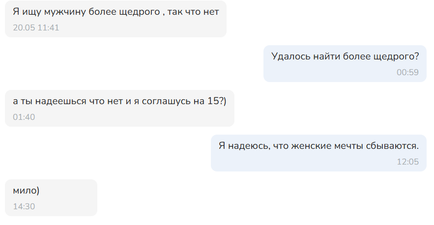 Сейчас это дало 20 диалогов, из которых с 4 перекатились в ТГ, 2 оказались не моего типажа, 1 ебанашка а 1 мошенница.