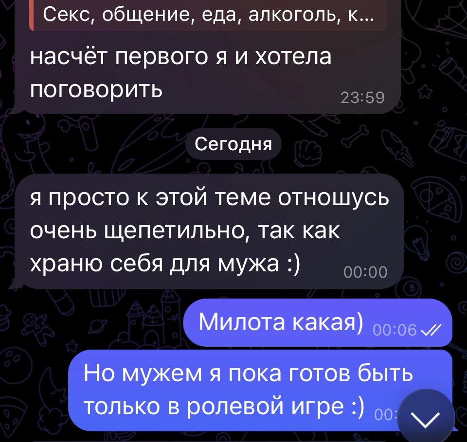 >>10332501 Познакомлюсь, в первую очередь, с адекватным человеком. Не курю, не употребляю, могу иногда немного выпить. Того же хотелось бы от партнёра. Соответственно, подтянутое телосложение должно быть. Любители экспериментов с женским телом - мимо, могу ставить опыты только на вашем ) Предпочту человека, любящего женскую доминацию и некоторую агрессивность. Встречи 1-2 раза в неделю (не у меня), устроит даже если без лишних вмешательств в жизнь друг друга, в целом, на ваше усмотрение. Первая встреча в виде самого обычного знакомства. 26-27 сентября будешь моей послушной девочкой?)