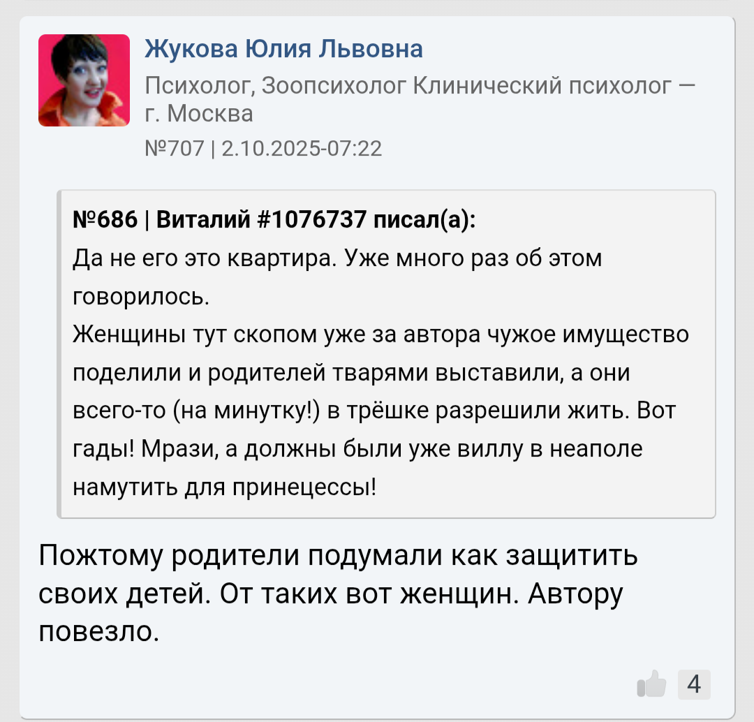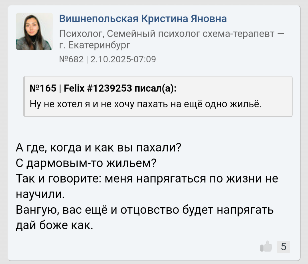 А как вообще смысл им что-то доказывать? Психолог на самом деле противоречит базе своим просто существованием. По сути, если ты принимаешь базу, то психолог это примерно что-то уровня мага. Если психолог решил твою проблему, то значит у тебя никакой проблемы никогда и не было. Ну это как вот, например, к психологу может обращаться какая-нибудь тяночка, какой-нибудь миллионер зажравшийся. У них просто загоны на ровном месте, вот и всё. Ну, поебланить им хочется. А у нас-то реальные проблемы. И вот реальные проблемы прикладыванием подорожника, гаданием на кофейной гуще, снятием порчи или рассуждениями в духе, давай я научу тебя общаться, не решить.