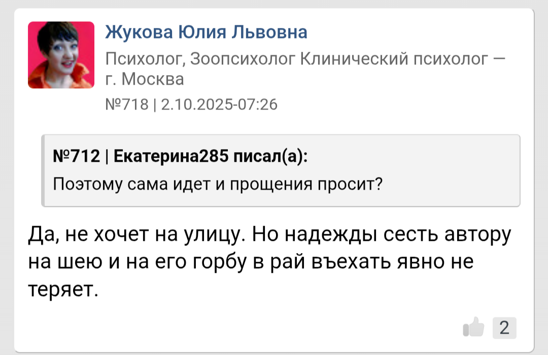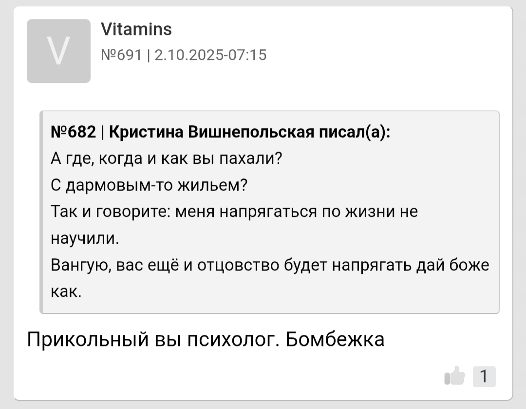 Короче сходил к КЛИНИЧЕСКОМУ ПСИХОЛОГУ и могу сказать что инцел-базу нормисным пиздежом уже забороть не выходит, ну в общем начал с того, что осознал что не смогу найти девушку и нормальные отношения. Далее диалог примерно такой: -Как понял что не сможешь? -Годы опыта, где надо весь год делать попытки, а в итоге на свидание удаётся вытащить примерно одну тян в год и та потом отошьёт или будет поехавшей/непригодной для отношений -Ну может ты таких выбираешь? -Слово "выбираешь" вряд ли тут подходит, мне как раз не из чего выбирать, когда я вынужден есть что дают. Когда человеку дают одно блюдо, нельзя же сказать что он сам его выбрал. -Ну мож не умеешь коммуницировать? -Я умею коммуницировать, когда нужно прийти к врачу, устроиться на работу, что-то купить или продать, с девушками я не единожды имел дружеские отношения, но они отказывались переходить к чему-то большему. -А вот я знаю басиста человека с уродствами, он арбузит тянку и она за него держится (тут я не смог сказать что любить уголовников - это конечно база, время было ограничено и тема разговора сменилась) Короче очень слабенько, опять намёки что за тебя научу общяцо при этом человек получил за час чью-то дневную зарплату и никак не запруфал что он знает хоть одну фишку, которая бы помогла клеить тяночек. Из полезного - прописаны витаминки, направлен к психиатру за антидепрессантами.