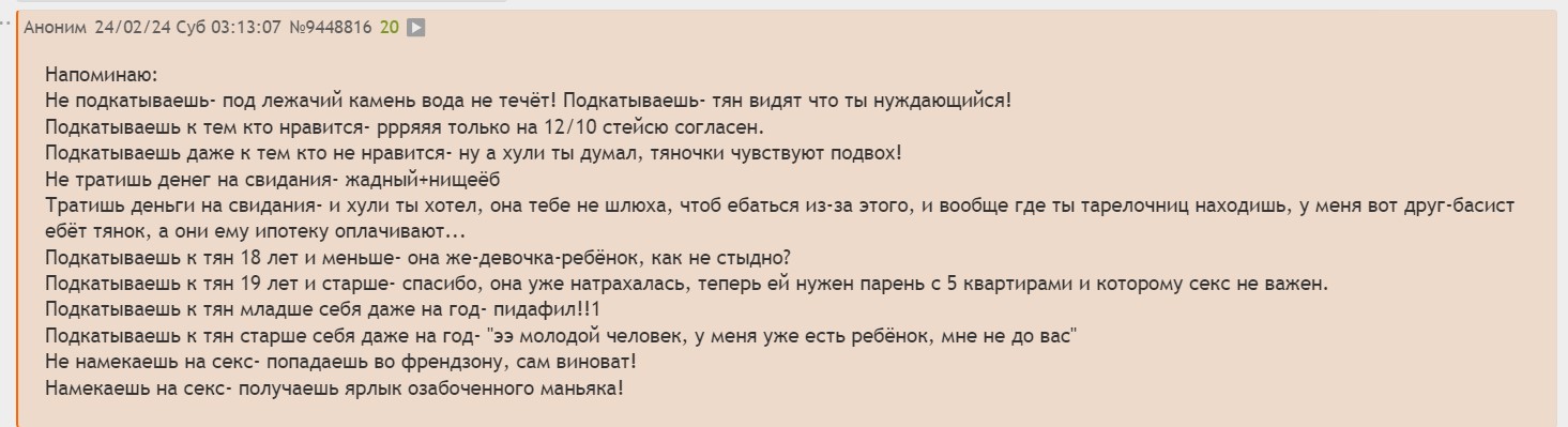 >>10358616 >Годы опыта, где надо весь год делать попытки, а в итоге на свидание удаётся вытащить примерно одну тян в год и та потом отошьёт или будет поехавшей/непригодной для отношений