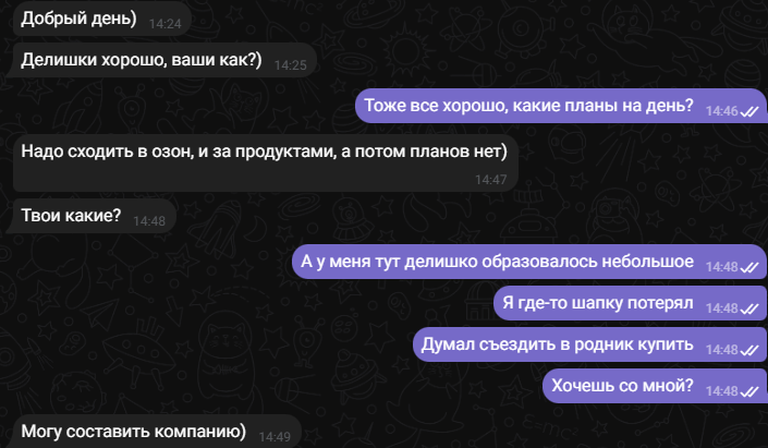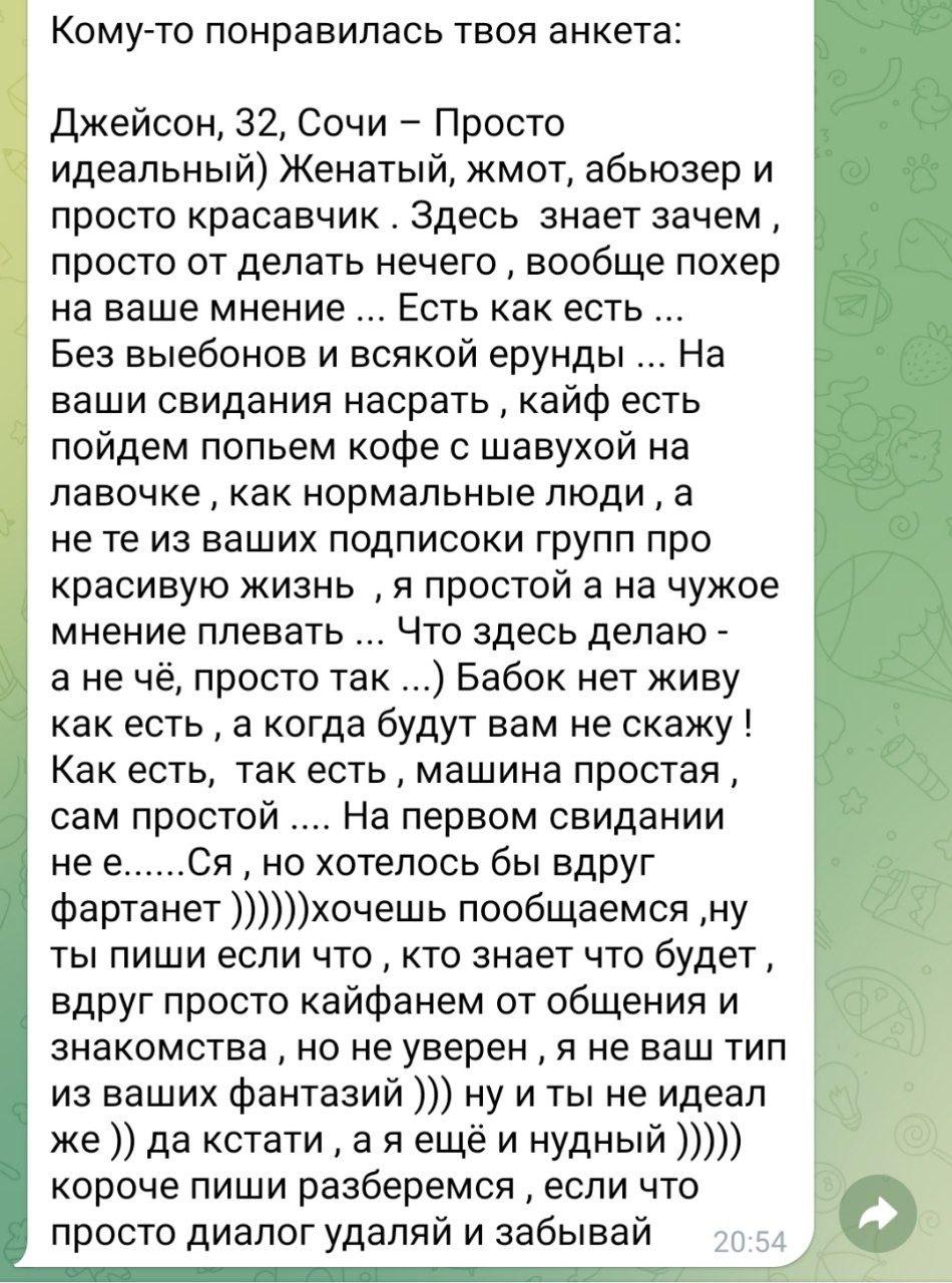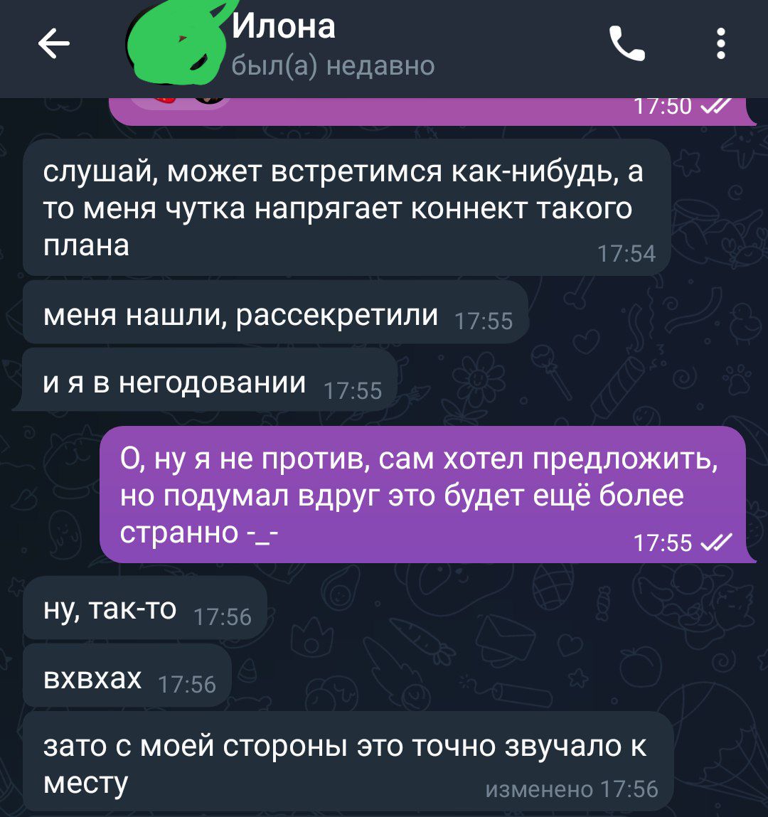 Кстати заметил момент, некоторые тянки почти сразу читают телегу, другие же могут даже через сколько-то дней прочитать или вовсе проигнорировать. Почему так? Им все-таки нравятся сообщения анонимов? С вк же ситуация другая - даже в онлайн может не заходить после отправки сообщения, то есть явно уведомления выключены.