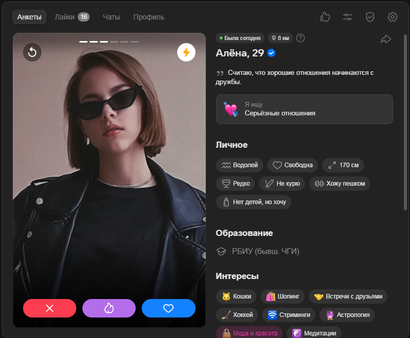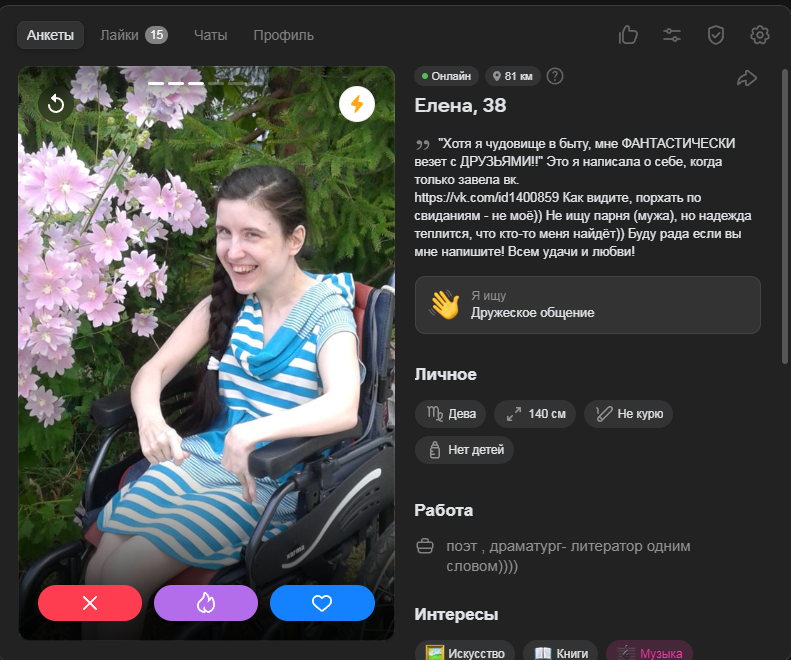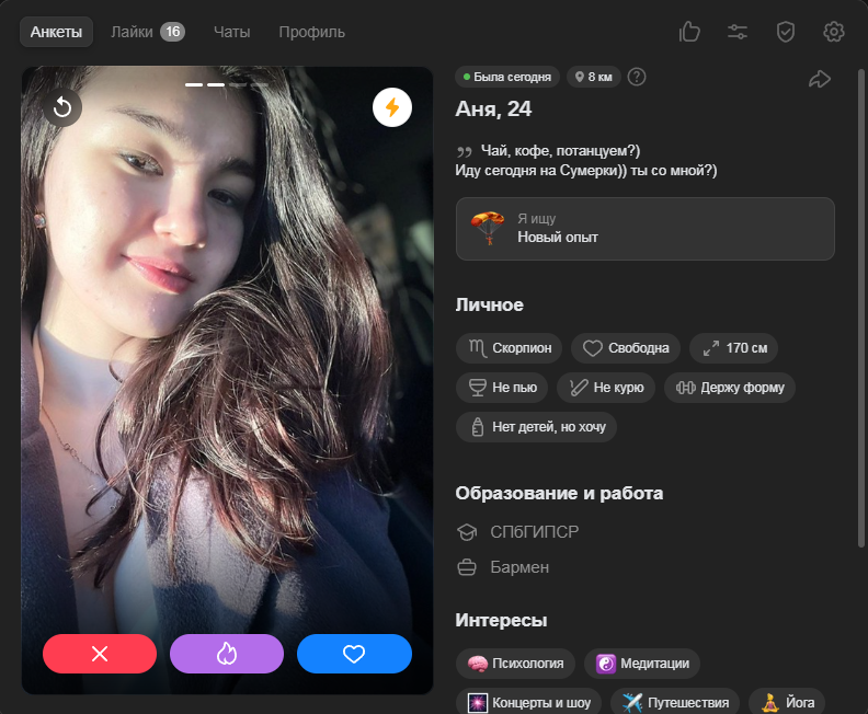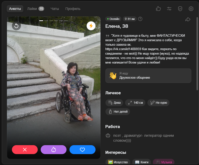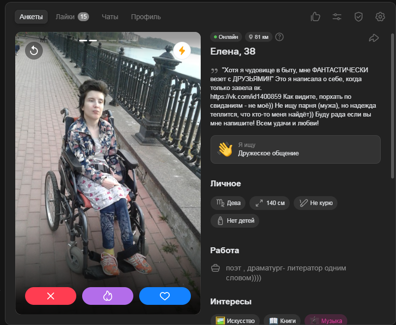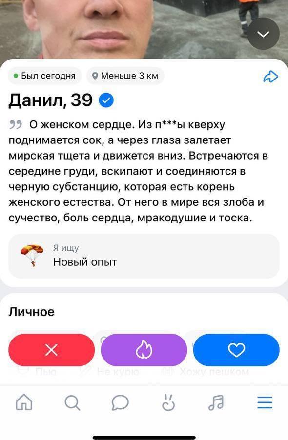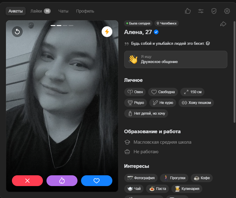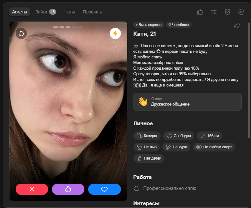 Алсо между делом. В винчике если ты девка и поиск по девкам. Там и сами лайки ставят и пишут и вообще в анкетах не стесняясь указывают что ищут фвб. За парня такое зуй увидишь.