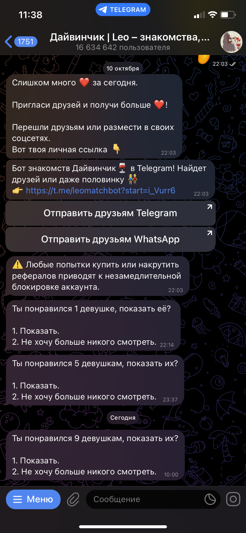 >>10366867 Не думаю, что у обычного бота в телеге есть алгоритмы какие-то. Есть только теневой бан, когда твою анкету просто не показывают, соответственно и взаимных нет. Не этот случай, так как лайки были.