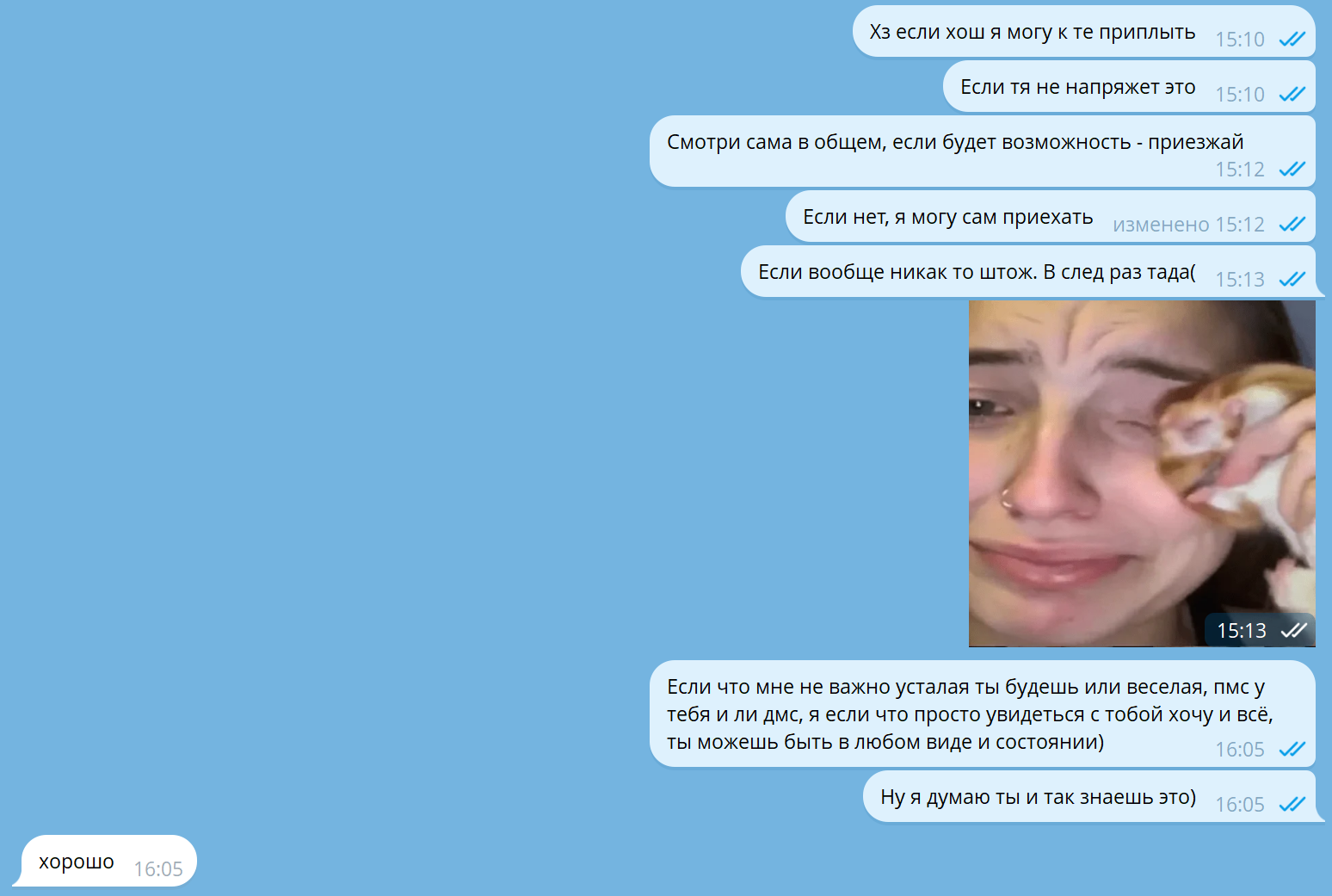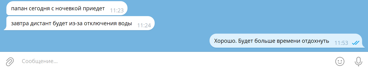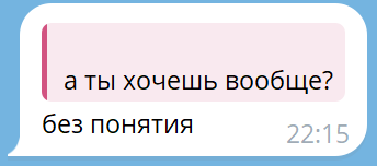 Вчера она написала мне после того как я уехал, часа через 2 где-то - "ты где", я ответил "дома", она скинула стикер с грустным котом и написала "Доброй ночи". Я овтетил "спокойной ночи". Дальше она скинула кружок где оттирает ссаку кошачью от дивана так как кошка снова нагадила на диван. Мы кратко обсудили ситуацию с кошкой, за тем она написала "голова болит пипец" я ответил что у нее это из-за вейпа с никотином который она ебошит как паровоз сейчас, что у меня от него башка болела до утра когда я попыжал его с ней в предыдущую встречу. Она это не читала, хотя заходила в сеть и через 10 и через 20 и через 30 минут. Потом видимо уснула. Утром вот написал мне то что на скрине. ВСё. Я прочитал и не отвечаю ей. Я не ебу что ей овтечать)