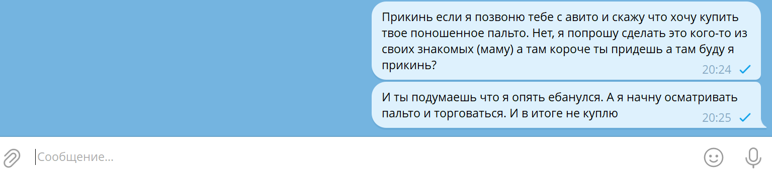 Всё равно что я сейчас ей напишу - отопление так и не включили, холодно. К чему мне вообще например ей это писать, я че придурок что ли. Нормальный человек напишет как ты/я уже скучаю по тебе/и так далее. А не инфу какую-то пустую бесмысленную непонятно к чему. Я типа вот вообще не понимаю а на хуя она в принципе пишет. И я догадываюсь почему. Потому что думает что жилеточка ее сейчас поддержит, утешит, успокоит. Тупо мою энергию тянет. Больше не выйдет.