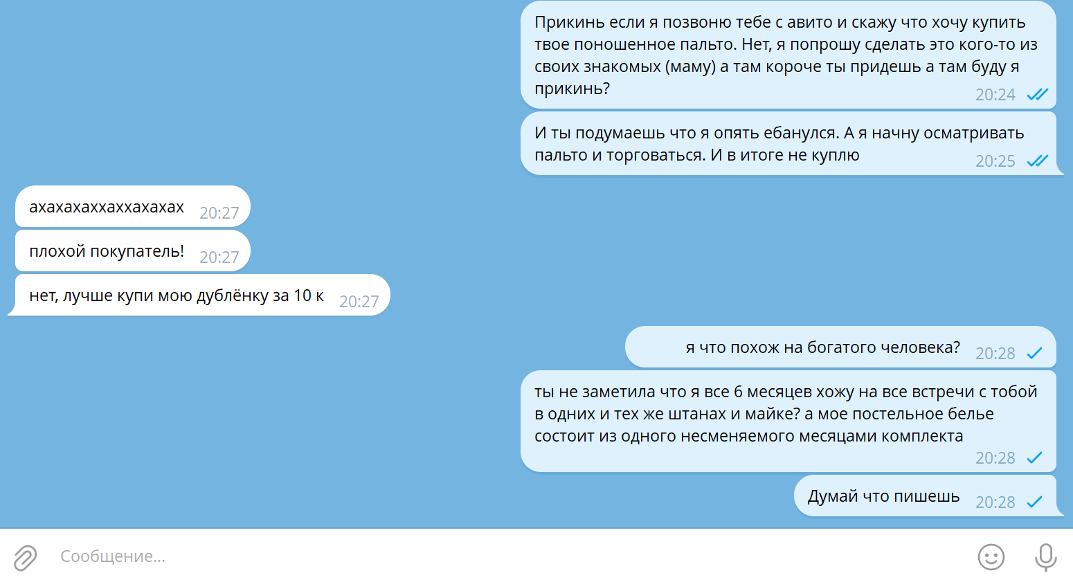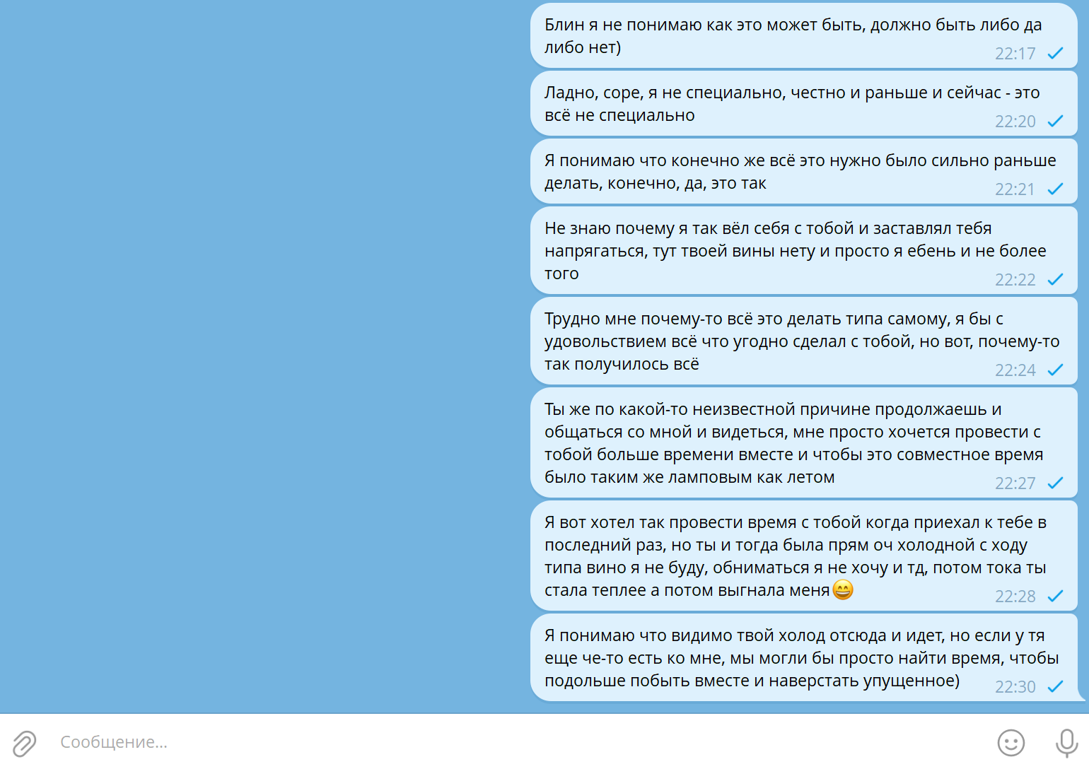 >>10374030 Да пошла она на хуй со своими огоньками. Я ей сначала 30 сообщений нахуячил в тг, а потом выяснилось что это могло быть уведомление об истории. При этом у нее уведомления с сообщениями из тг на экран телефона приходят.И она в тг не в сети была, а в вк заходила. Мои сообщения были не прочитанными, но она могла их видеть на экране. Я у обоих всё стёр на хуй, но не удерджался и всё равно накинул еще, но чуть попроще и помягче. Бля устал уже от этой ебатории.