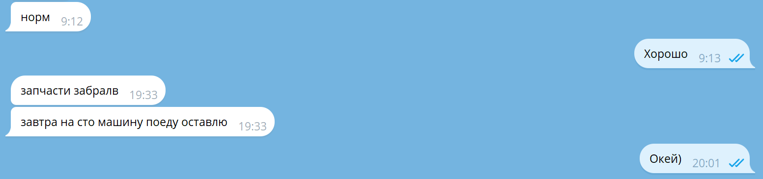 Вот примерно так выглядит наше общение сейчас) я просто ей отвечаю в 1 слова типа "ок/хорошо/окей" и всё) Как будто бы ваще хуйня полная) При этом мне она ни одного вопроса не задает)