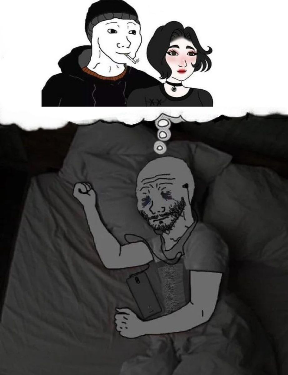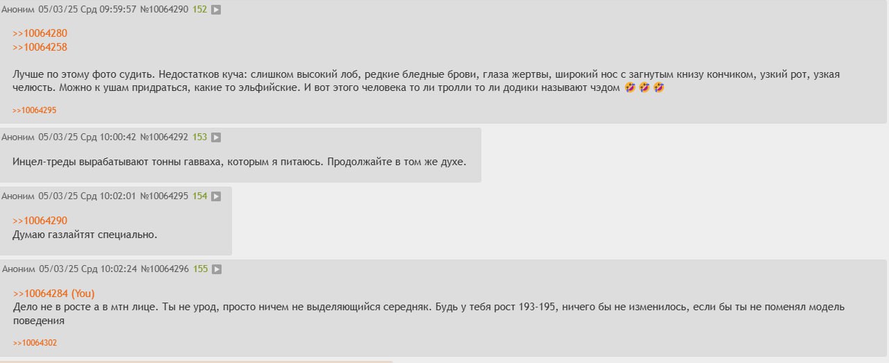 >>10381614 → Ну вот мне и тут не особо повезло. Видимо, по юности был просто глуп и сильно было самовнушение с дества, что рост не важен, что чуть красивее обезьяны и я верил, хотя все говорило об обратном, даже на примере того универского приятеля. Причем, мне даже почти напрямую давали понять, что я такой себе. Я пилил много раз стори, как однажды стоял со знакомой между парами, курил, беседовал и к ней подъехала подруга что-то отдать. И когда она отчалила, я спросил у своей знакомой, мол, свободна ли твоя подруга? Она мне очень понравилась. Та на меня очень странно посмотерла, с каким-то удивлением, даже, и ответила, цитирую: Как бы тебее сказать...Ей немного другие парни нравятся. Я в тот момент даже уточнять не стал, какие именно, но запомнил на всю жизнь ту фразу и осознал ее только лет 10 спустя Или момент один, когда я гулял с приятелем и к нам присоеденились его сестра. Мы беседовали все вместе и я ради шутки сказал, контекст уже не помню, что типа, я красавчик. Его сестра тут же скрвила лицо: Ну я бы не сказала... И таких моментов было очень много, просто я коупил. Помню, я еще часто думал, почему же ко мне девушки не подкатывают никогда. Знаешь, чем я коупил? Что они стесняются меня! Прикинь? Я хорош собой, а они просто боятся подкатить! Пиздец дегенерат