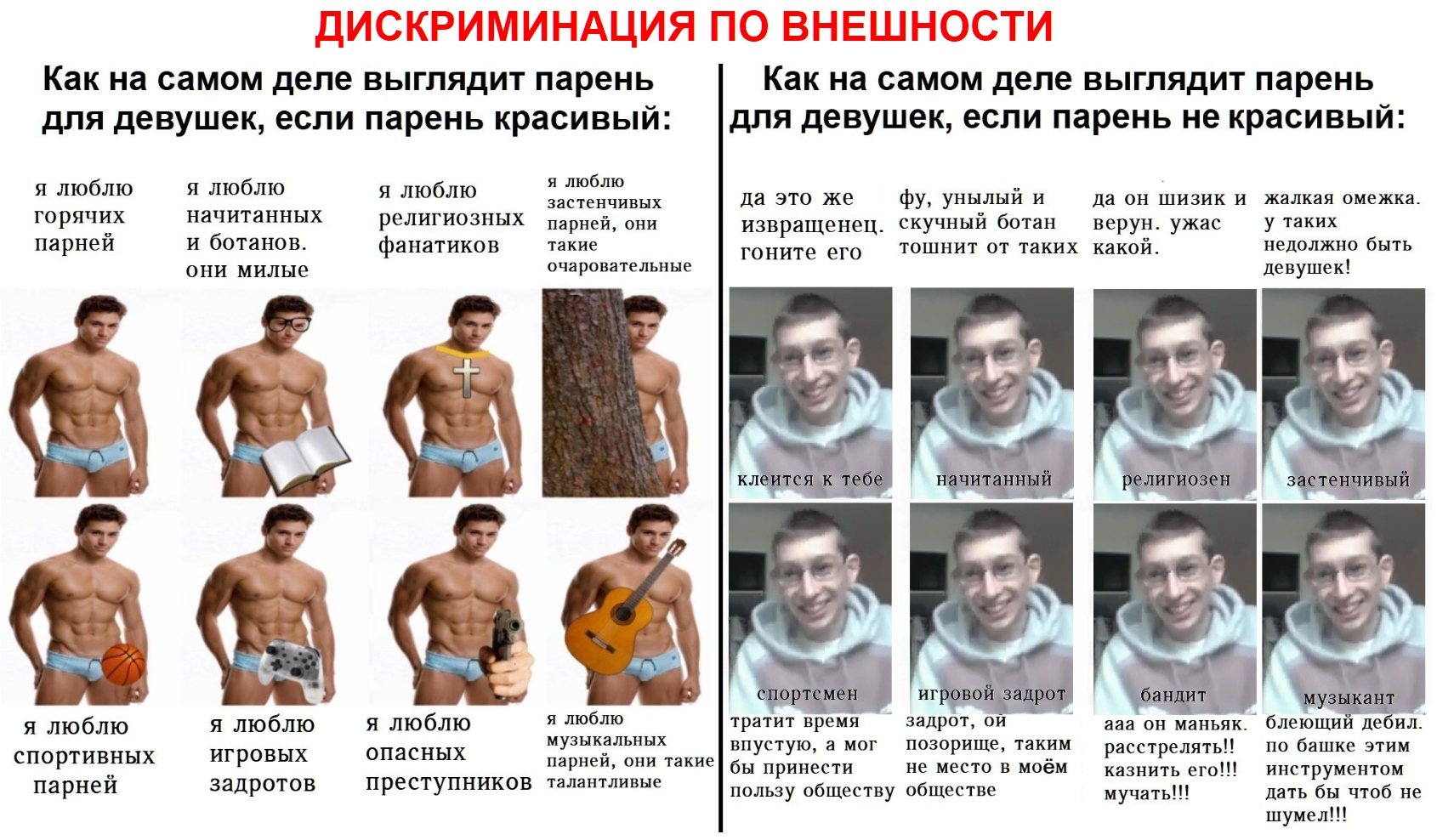 Кому здесь не рады: -- порваткам-бревноотрицателям (и их лидер_ке Шестикласснице) с их мантрами "нормы не существует". Смотрите раздел "База". -- персонажам, которые заходят похвастаться топовой тянучькой и потешить своё ЧСВ. Если вы хотите помочь советом и поделиться экспой -- вэлкам. Если вы хотите проникнуться, насколько всё плохо у анонов-бревноёбов и порадоваться за себя - тоже окей, хотя это и guilty pleasure, но пусть хотя бы пойдёт на пользу вам и вашему отношачу. Но если вам хочется похвастаться и повыёбываться на фоне прочих - занимайтесь этим где-нибудь ещё, ИТТ обсуждаются весьма болезненные и чувствительные темы. -- перевозбудившемуся Шестиклассник-куну и его собратьям по разуму, со всеми их охуительными иториями о воображаемых любовных победах и прочей кринжатиной: борда 18+, не забываем. -- вездессущим инцелам с их боевыми картиночками о том, что тянучка - бревно лично для тебя, а с чэдиками скачет по хуям только в путь. Нет, такое, конечно, тоже случается, но ультимативное деление мира на чёрное и белое - это не для взрослых людей. -- скрепоносным шизам, у которых тян должна ходить в платке под конвоем родителей и братьев, а сексуальность проявлять только по желанию мужа в миссионерской позе.