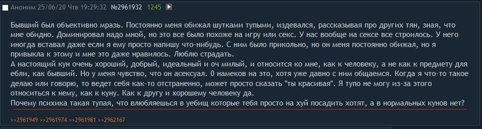 >>10386809 Мне кажется, мы тут в упор приближаемся к тяжёлой, неприятной, неудобной правде про ваши отношения, которую очень не хочется принимать, но всё-таки - к правде. >Как человек он мне очень нравится и я его люблю Сильно сомневаюсь, что то же самое можно сказать про него. Ну блин, ну 500тыщ раз про это уже говорено. Давай просто назовём вещи своими именами: вот человек стремится делать тебе приятно тем, что (например) готовит тебе вкусняшки, или отвозит тебя куда-то, или смотрит-обсуждает с тобой что-то, или тупо подкидывает бабла, или делает приятные сюрпризы, или как-то иначе заботится-о-тебе-тем-способом-которым-ему-не-обременительно. НО как только дело доходит до такой важной вещи, как секс - он мгновенно превращается в равнодушного, эгоистичного, абсолютно-не-эмпатичного, глухого к твоим словам и просьбам, может быть даже озлобленного и токсичного человека. НУ НЕ МОЖЕТ ТАКОГО БЫТЬ, чтобы человеку, которому ты небезразлична, которому действительно "не всё равно" - это "не всё равно" работало только в тех местах, где ему самому УДОБНО, а в любом другом случае ты хладнокровно посылаешься нахуй и разбираешься со своими проблемами сама. И ладно бы ещё шла речь о каких-то ебовых жертвах, о чём-то нереальном, о яхтах-дубаях, о том что обнаружился твой ребёнок от прошлого брака или, напротив, всплыло бесплодие. Но речь же о самом-самом элементарном и базовом. ДУМОЙ. >он уникальный и делает все для меня. Но только не в плане секса. Знаешь, в 99 случаев из 100, когда начинаешь в этой платиновой ситуации вскрывать эту тему подробнее: "а что конкретно такого невероятного и уникального он_а делает?" - выясняется, что абсолютно ничего уникального и невероятного человек и не исполняет особо. "Ну мы там типа разговариваем, ездим куда-то, кинцо смотрим, он вкусняшки из магазина привозит". А вся уникальность, идеальность и невероятность - результат самовнушения, копиума, боязни признаться себе в том, что происходит пиздец блять нахуй и человеку на тебя плевать. Кстати, насколько давно вы вместе и какой вы лвл, не напомнишь плиз? Он первый у тебя/ты у него? Если да - это многое объясняет