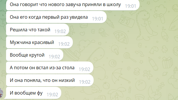 Как то раз, когда я учился в учебке, мне было 20 лет на тот момент, группа решила собраться и бухнуть. Начали обсуждать кто пойдет, а кто нет. И вот дошла очередь до моей парты, за которой мы сидели вместе с корешем, он брюнет, рост 180, дрищ. Тянки пиздец как начали его уговаривать пойти, а он не хотел, у него была девчонка с которой встречался. Долго, долго они пытались его уломать и последний их довод был, что если он захочет, то могу вместе с ним пойти и я. Меня вообще никто не звал, просто вот если он захочет, то... Бля, вот в тот момент я понял, что я тот ещё квазимода Хотя потом был случай, когда эти тянки передавали мне записки, с вопросами: почему я всё время молчу, есть ли у меня тня