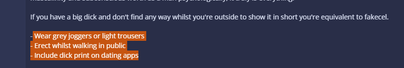 >>10389971 Да, там пиздец творился, скуфы цепляли инстателок и молодых тянок, тупо идёт скуф полностью лысый и к тёлке подкатил на 5 баллов выше его она естественно отшила его, потом за минуту другой тип подошёл и так за минут 10 где то 5 типом подходили к одной тянке, а она как норму это воспринимала и так все тянки так, тупо брутфорс и к удивлению это многим так помогло, особенно в разгар вечера когда набухались все. Ещё было такое что мужик дал сто баксов тянке за то чтобы она отъебалась от него и ее подруги потому что он хотел эту подругу заарканить, та тянка взяла бабла и оставила их, но та все подруга всё равно отшила его. С этой подругой кстати я познакомился и обменялись контактами и проводил до такси,потому что она не местная, но хз посмотрел ее фотки она задохуя успешная и старше лет на 5-10 не потяну ее финансово, наверное просто ростом зашёл ей или ненавязчивостью хз карч, но это такое, вот когда вернулся там бар закрыли и на улице продолжали люди бухать и ко мне подкатила тян 180 ростом но она 2,5-3/10 максимум и лет на 5 старше, бля ещё подруги были возле нее охуенные на 6-7/10 но она оказалась самой смелой и инициативной, пришлось обменяться контактами. Все разошлись и она сразу написала что я красавчик и когда пойдем на кофе.. бля а когда был в баре то всем было похер, но я и сам не подкатывал особо, так был за компанию и наблюдал за этим всем, но в поле зрения тянок был и всегда проходили но как то пох им было на рост и стиль, реально челики ниже меня и уродливее (я хайтир максимум, тяжело судить но точно не Чед но и не саб5) тупо цепляли телок на глазах и те велись. Честно говоря настроение хуйня после этого, хоть и взял пару контактов но нихуя не будет с этого, потому что топовая не даст, а со стрёмной я буду себя заставлять быть и вообще хочу чтобы она отстала, надеюсь протрезвеет и накал ее спадёт. И да, блекпилл в таких барах работает на 30-40% остальное редпилл. Слушал разговоры, такие примитивные тупо с балды по пьяны несут чушь а тянкам заходит. Ладно, написал простыню, хватит