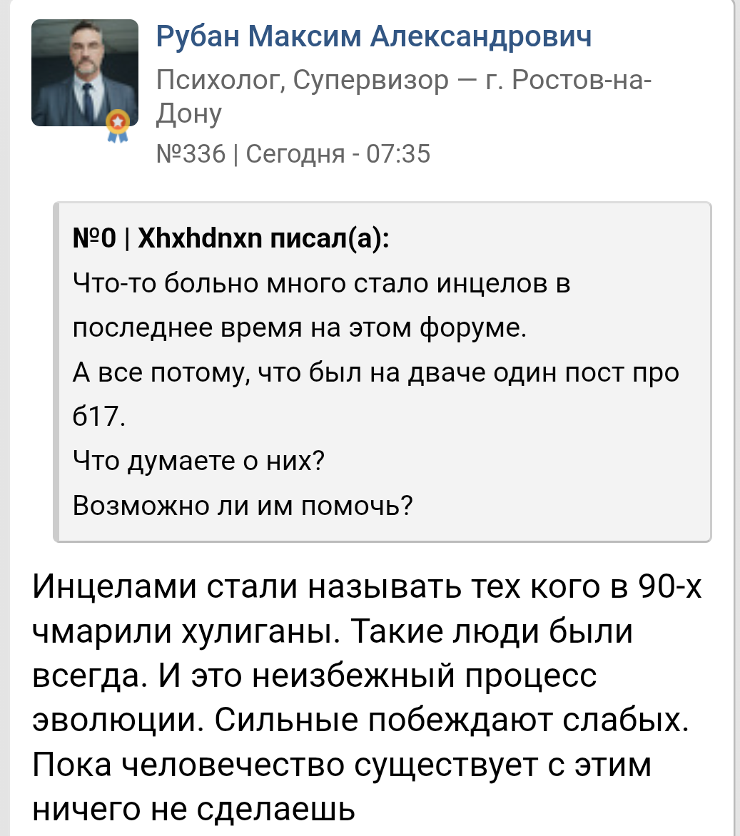 >>10391386 (OP) В тред приглашаются инцелы 21+ лвла. Инцел - девственник не по своей воле. Если вы имеете комбо по этим пунктам: 1. Рост ниже 180 см. 2. Член менее 15 см 3. Внешность хуже, чем 5/10 4. Наличие узкой челюсти, отсутствие подбородка, плохая максилла 7. Листва 8. Никогда не целовался 9. Излишняя худоба или излишний жир 10. Нищебродство 11. Норвуд. (ранее облысение) 13. Подростковый возраст прошёл за видео-играми или просмотром аниме 14. Отказы от противоположного пола на СЗ/ИРЛ/школе/универе/работе, несмотря на попытки познакомиться/назначить встречу/пообщаться с дальнейшем игнором и ЧС то добро пожаловать в наш скотомогильник! На заметку: внешность>рост>хуй. Но лишь при условии, что рост>=183 см и/или внешность >=7/10, в ином случае последние будут препятствием на фазе знакомства. Делимся проблемами, переживаниями, поддерживаем друг друга. Основная теория: https://incels.wiki/w/Main_Page
