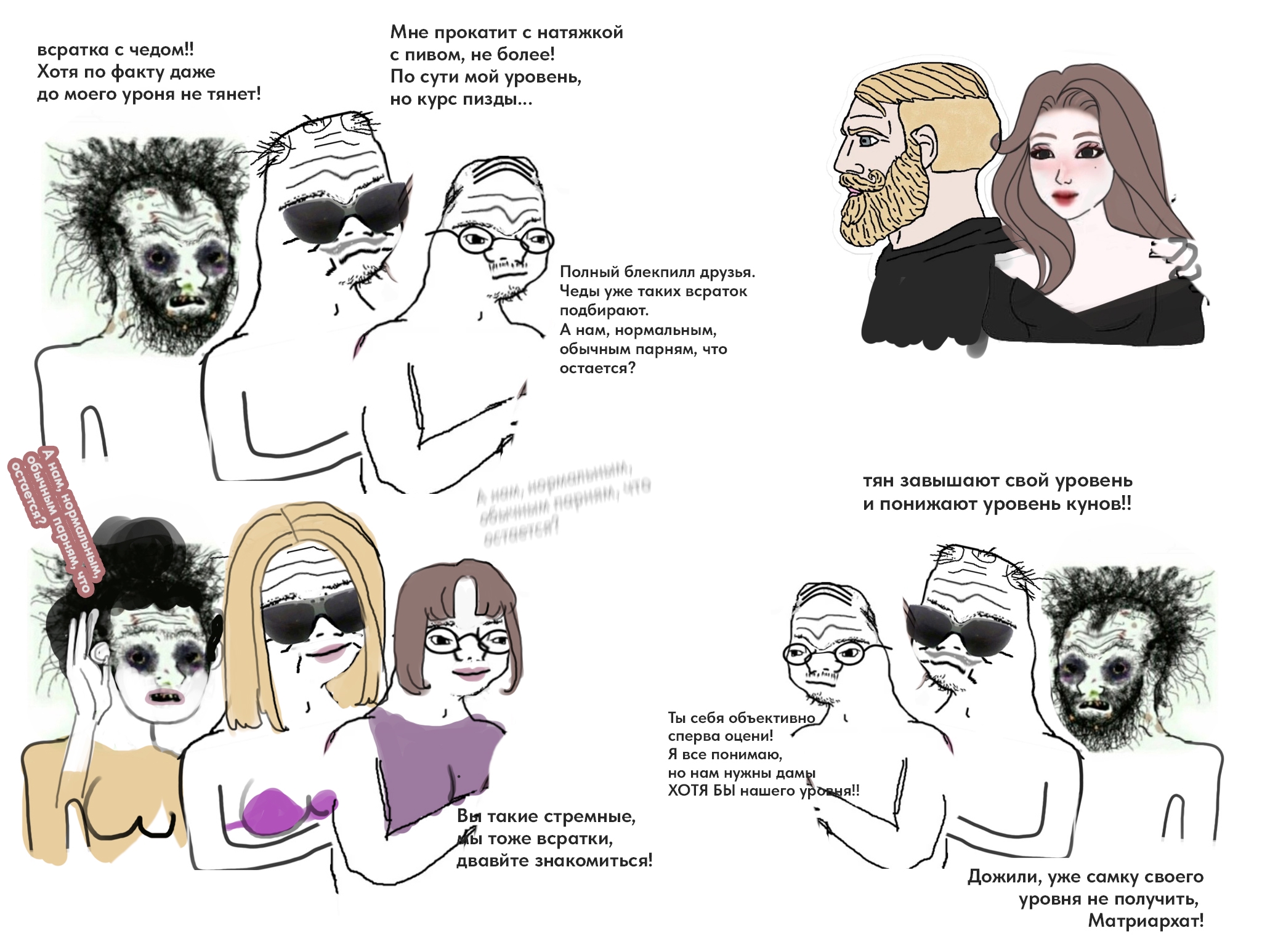 >>10438542 >Так и всратки в нее не вписываются, единственное преимущество всраток перед инцелами это то, что у всратки больше шансов найти себе кого-то на проеб, ибо на безрыбье и собаку. Только вот чтобы быть инцелом, достаточно не входить в 10-15% топовых племенных быков. Чтобы быть всраткой, нужно входить в 5-10% самок, которым реально не повезло с внешкой. >Женщины гораздо быстрее набирают вес и гораздо сложнее его теряют. Вот только в наши вагинодефицитные дни, чтобы жир реально делал женщину неликвидом, это должна быть крайняя стадия ожирения, когда человек уже вынужден ездить на скутере. >Про волосы тоже рофл, их мало отрастить, надо чтобы они были не на мочалку похожи, а это дохуя труда даже при хорошем исходнике. Говорю как обладательница длинных волос. Ах вот оно что, ты просто фемка на спецзадании, которая отрабатывает повесточку: "Королевишны тоже плачут"... >Да ладно?)) Глянь пик, на 25% уже запишут в жируху. У тебя 30% выглядят гораздо привлекательнее чем 25-26%, ты в курсе? Ах да, конечно же нет, женщины ведь не могут понять что нравится мужчинам (не сарказм). То есть, дело не только и не столько в количестве жира, сколько в его качестве, в том как он распределен по телу. >В то время как для тян требования существовали всегда, и их даже перестали замечать. Манюнь, для тян требования давно исчезли. В инцел-треде давно мечтают о 30-летке, с ожирением первой степени. При этом кстати, "возрастошиза" - отнюдь не шиза, в отличие от ростошизы.