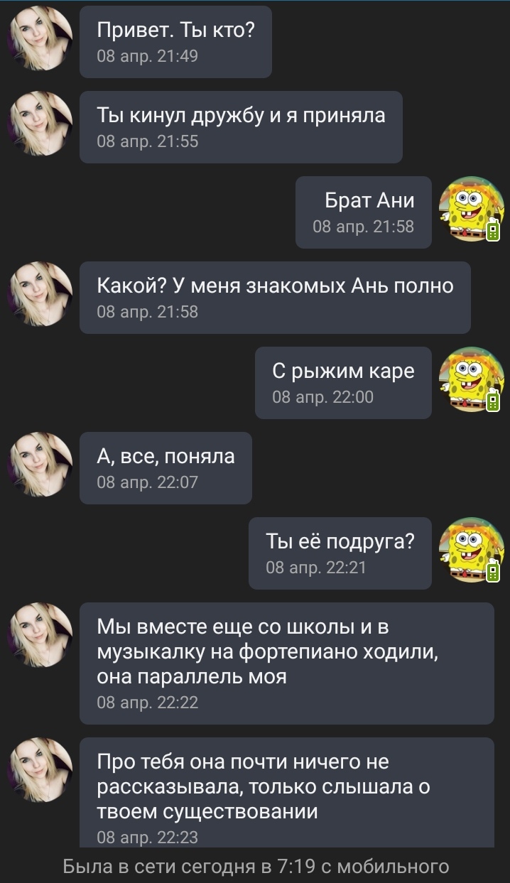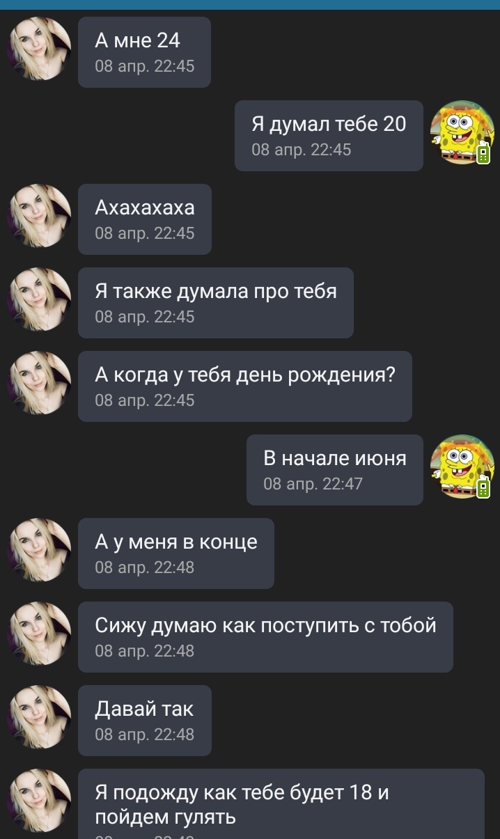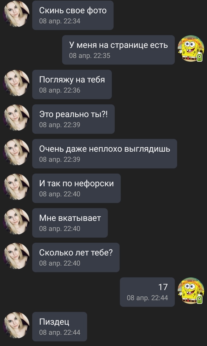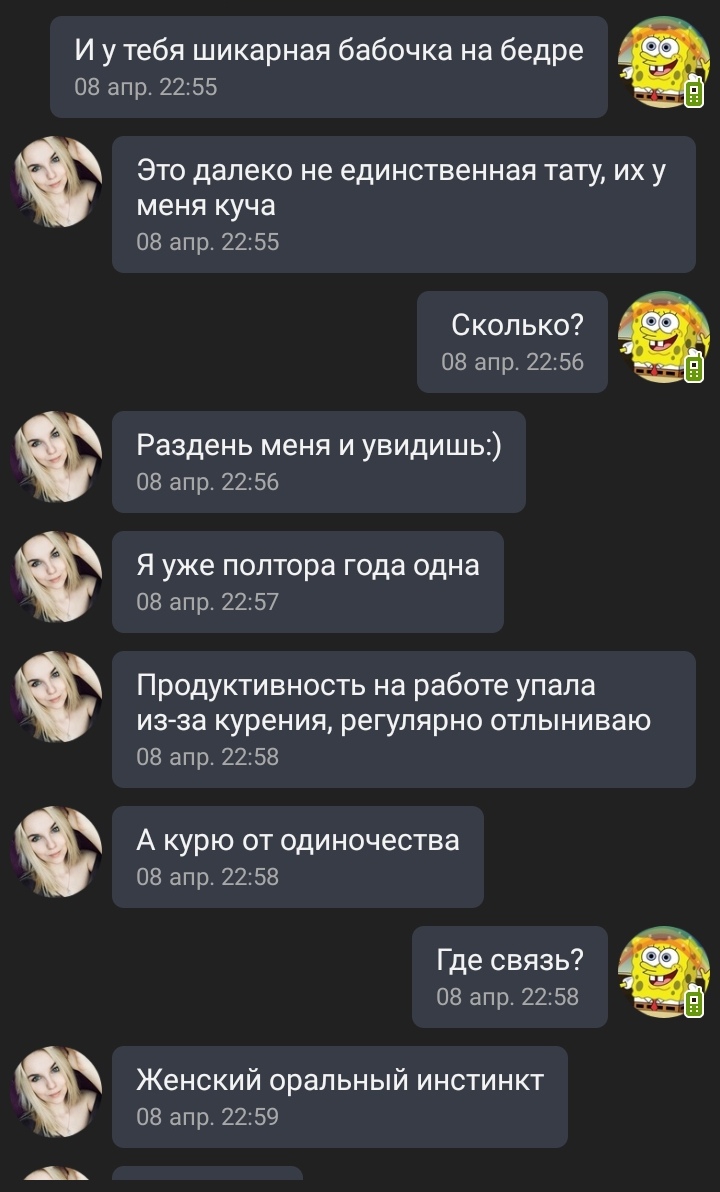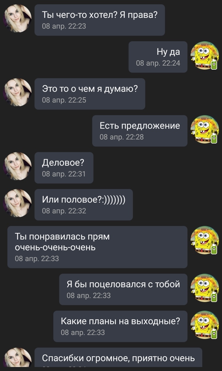 В очередной раз проиграл с авы со спанчбобом. Хоть и боян, но тян как тян, знает чего хочет, проявляет инициативу, и это охуенно