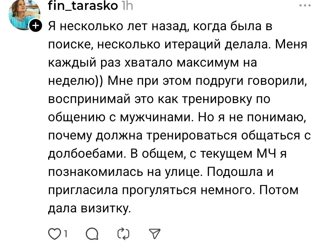 >>10414737 ну мне так тянки говорили знакомые за свою подругу, вот пиши первым тянке(даже не виделись еще) она ждёт что ты будешь писать первым, она любит чтобы парни первые писали и парень если первый не пишет, то он редфлаг! ведь она же спрашивала за тебя, но на встречу общую с компанией не пошла, отмазки появились, вопрос чтобы изменилось если бы написал? вот и спрашиваю тебя, что ты бы делал в такой ситуации, если подобная тян выше тебя по внешке и статусу и со старта где личного контакт не было уже начинать ей что-то писать