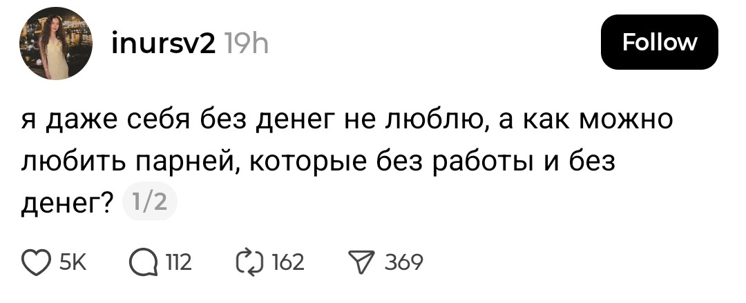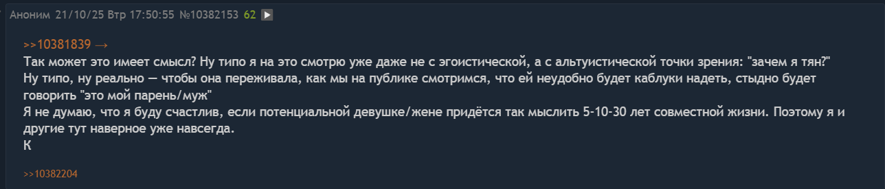>>10414648 > Можешь процитировать мои вопросы? Да пожалуйста, хоспаде. Амнезийный ты наш. >>10410488 → >Я три года встречался с женщиной, от которой было ноль инициативы, вот просто никакой. Да хотя бы просто подойти, обнять, поцеловать - никогда. Назвать как-нибудь нежно, а не по имени? Никогда! Я, однажды, ради эксперимента, более трёх месяцев к ней не приставал. И знаете что? Все эти месяцы секса у нас не было. И поцелуев тоже. Там много было такого, от чего анон ты офигел, я в других тредах писал пару раз ранее. Вот хотя бы, ситуация, когда мы обсуждали внешку, чисто без привязки в чему-то конкретному, а в общем, и она мне сказала, видимо, не подумав, буквально следующее: я бы никогда не стала рассматривать красивого мужчину для серьезных отношений или семьи, потому что они ненадежны, изменяют, за ними всегда девки таскаются". Я так офигел, что даже не нашел, что ответить. Ведь как раз от меня то она хотела семью, детей, серьезные отношения. То есть, исходя из этой логики, я для нее стремный, получается? Или, например, как она никогда не стремилась подкачать условную попу для меня, держать фигуру в тонусе, хотя время у нее есть, она из дома работает, в офис ходить надо максимум раз в пару недель. Или могла не побрить ноги, а на вопрос, норм ли ей, отвечала:"Ну а что такого? Ты же мне близкий человек, я тебя не стесняюсь!" Может, я загонялся и это и правда норм? Ну и она стеснялась целовать меня на публике и всегда отворачивалась, когда я сам пытался ее поцеловать. Типа, неприлично и все такое И вот подобного было прилично. Ну и никогда меня не ревновала, вот просто ни разу за все время Изначально, я хотел с ней и семью и детей, но не был уверен, что хочу именно жениться, чтоб все официально было. О чем через год отношений ей заявил. Мол, Катя, давай заведем ребенка, но без всяких браков и прочего. На что мне ответили, что нет, так не годится, она хочет гарантий, что в случае чего, она будет получать алименты. Пышная свадьба и прочая шулуха ей не нужны, но вот штмап - обязателен. Я ей пояснил, что даже если мы не будем женаты и я свалю, то все равно меня обяжут платить алмименты. Но нет, убедить не удалось. Через год я ей сделал таки предложение, подарил кольцо. Но и тут согласие она сразу не дала. Типа, да, я хочу выйти за тебя, но давай обсудим всякие детали. У меня с работой на тот момент было не очень, зарабатывал мало да и сейчас не фонтан, а потому она стала предлагать мне сменить ее, потому что денег, типа, хватать не будет, пока она 3 года в декрете проведет. Потом стала спрашивать меня, как часто я буду пить пиво и проводить время вне семьи. Я сказал, что раз в две недели мне обязательно надо побыть денек одному, потому что я всю жизнь живу один и не потяну проводить 365 дней в году с семьей. Ей показалось, что это часто. Еще момент: я упоминал, что денег у меня не так много, я живу экономно, а потому ездить отдыхать за границу в данный момент счел не разумным. Вот она два года подряд ездила без меня. Для меня подобное не проблема, но анон в одном из тредов написал, что это - пиздец, когда баб ездит без своего парня отдыхать. Далее: я живу один в большой квартире, потому что родители уехали за город в частный сектор, а квартиру оставили мне. Звал ее к себе, но она сказала, что не поедет, потому что не будет чувствовать себя в ней хозяйкой, потому что это не полностью моя квартира, а общая с родителями. Свое