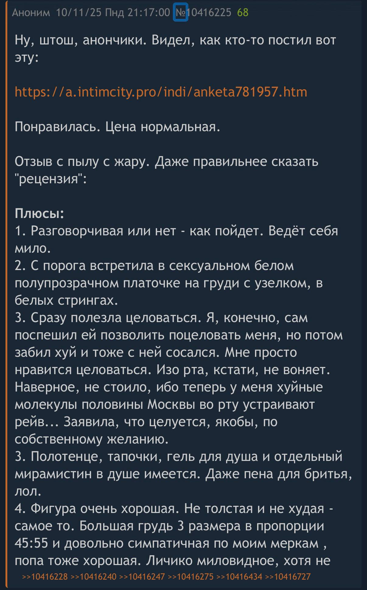 >>10417461 О, знакомая личность. Был несколько раз ещё по 10к. Штаны и свитер - это ее излюбленное для себя. Но у нее куча платьев. Если анон хочет шика - надо диспе написать об этом, Мита наденет чего хошь, она охуено умеет себя подать. А на своей волне - ну, это да. И она ни разу не гфе, ни на минуту не даёт забыть, что это работа, но при этом общается очень искренне как-то. И ебется супер качественно. В моем топ-5 самых ебливых шлюх, у кого был. Но остальные с том топе как правило всратки, а эта реально симпатичная, хоть и полторашка, но очень гармоничная. ЗЫ: блин, аж сходит захотелось!.. сцук, вечно у меня так: отложка ломится от новых анкет, но как способ кого-то - тянет...)))