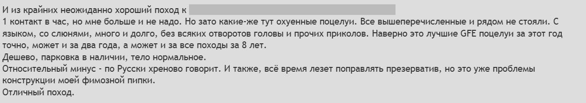 Итог: Это был не худший опыт в моей жизни, учитывая, что я достаточно неплохой. К посещению можно порекомендовать за исключением одного "НО". Если она вам понравится и захотите продлить - хуй там. Обговаривайте или бронируйте заранее. Лучше платить наличкой.