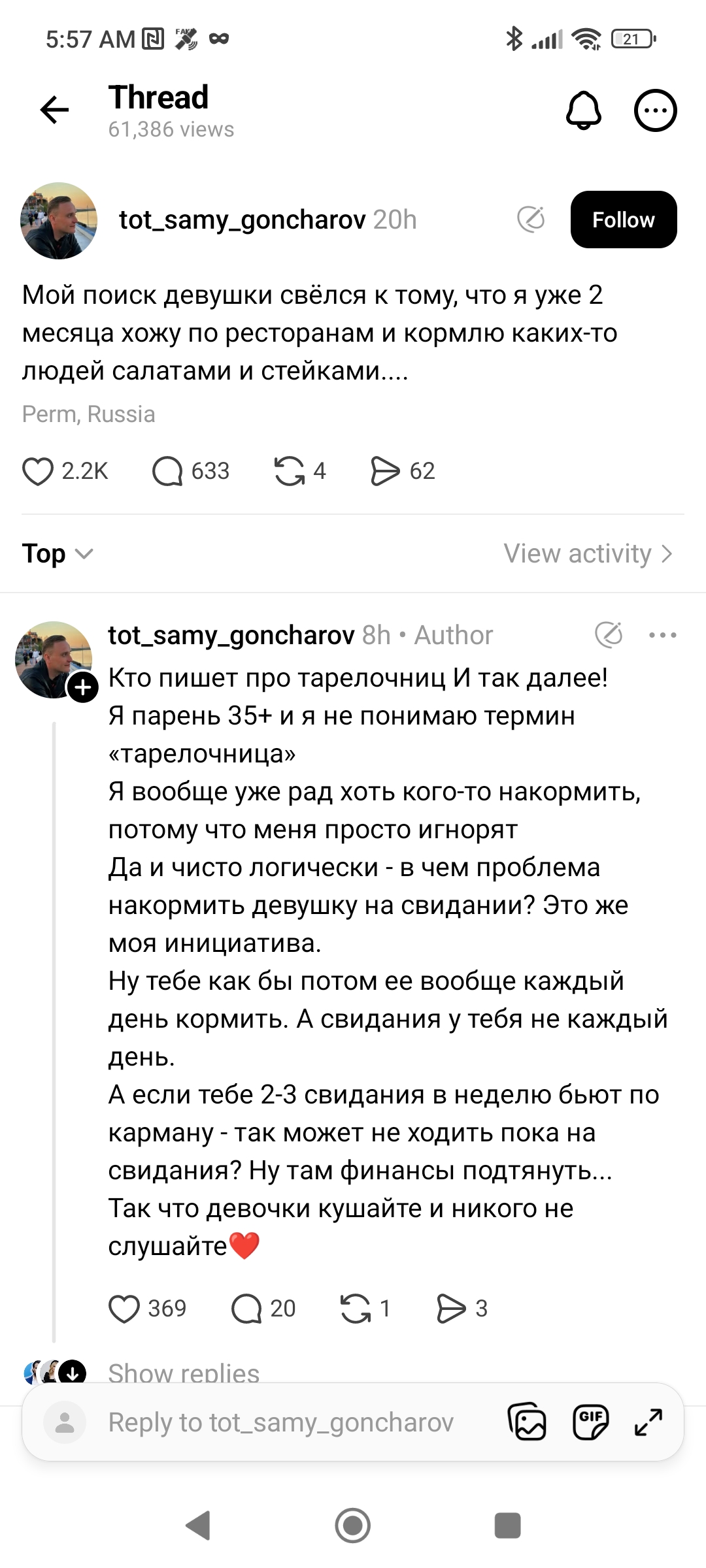 >>10451020 Год - это золотой стандарт конфетно-букетного, это время, когда такие вопросы вообще еще не поднимают. Посмотрю, как он будет себя вести через этот самый год, потому что как я уже сказала, мы встречаемся почти год. Естественно, инициатива должна от мужчины исходить. Ну и я сама еще для себя ничего не решила, меня как бы и привлекает, но и немного напрягает его властность и желание контролировать. Боюсь, может абьюзером оказаться, если поженимся. Будем дальше смотреть, как и что.
