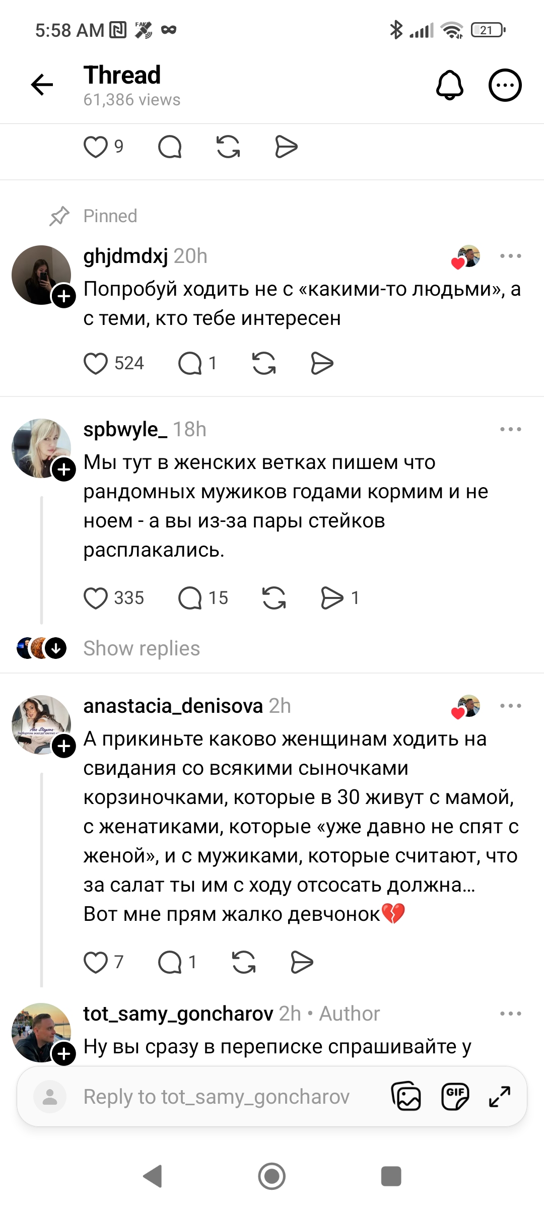 Где-то между 25 и 45 к бабе приходит осознание что теперь она не нужна окружающим если сама за себя платить не будет (к некоторым никогда не приходит). От этого у них всё пригорание. А мне, 39-ти летнему нескуфу, ровесницы не нужны. Молодые дешевле.