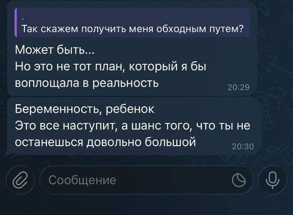 И как бы дело в том, что она заранее понимала, что я в этом плане более осознанный и скорее всего рано или поздно закончу отношения, и тема беременности буквально поднималась в контексте удержания, хотя она, вроде как, написала однажды - пик 2, что она не планирует такой план действий
