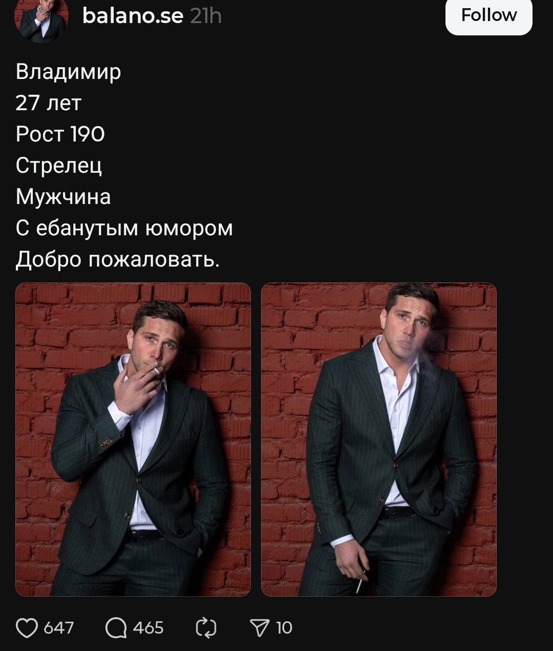 Есть очень интересный паблик, прошмандовцы русской эмиграции, где женщины ноют про мужчин, которые их обидели. Мужчин там деанонят и интерес представляет то, как выглядят их ебальники. Вот например фото последнего мужика и выдержка из поста: