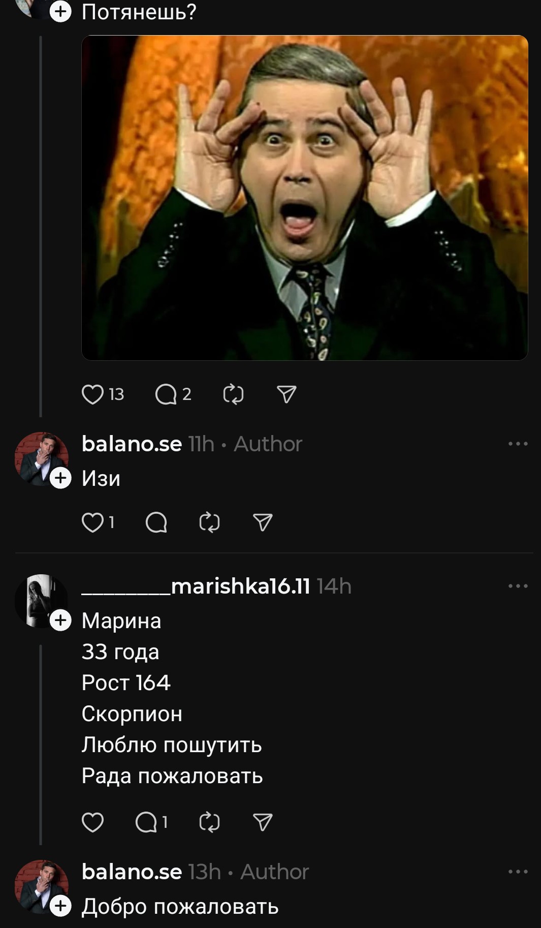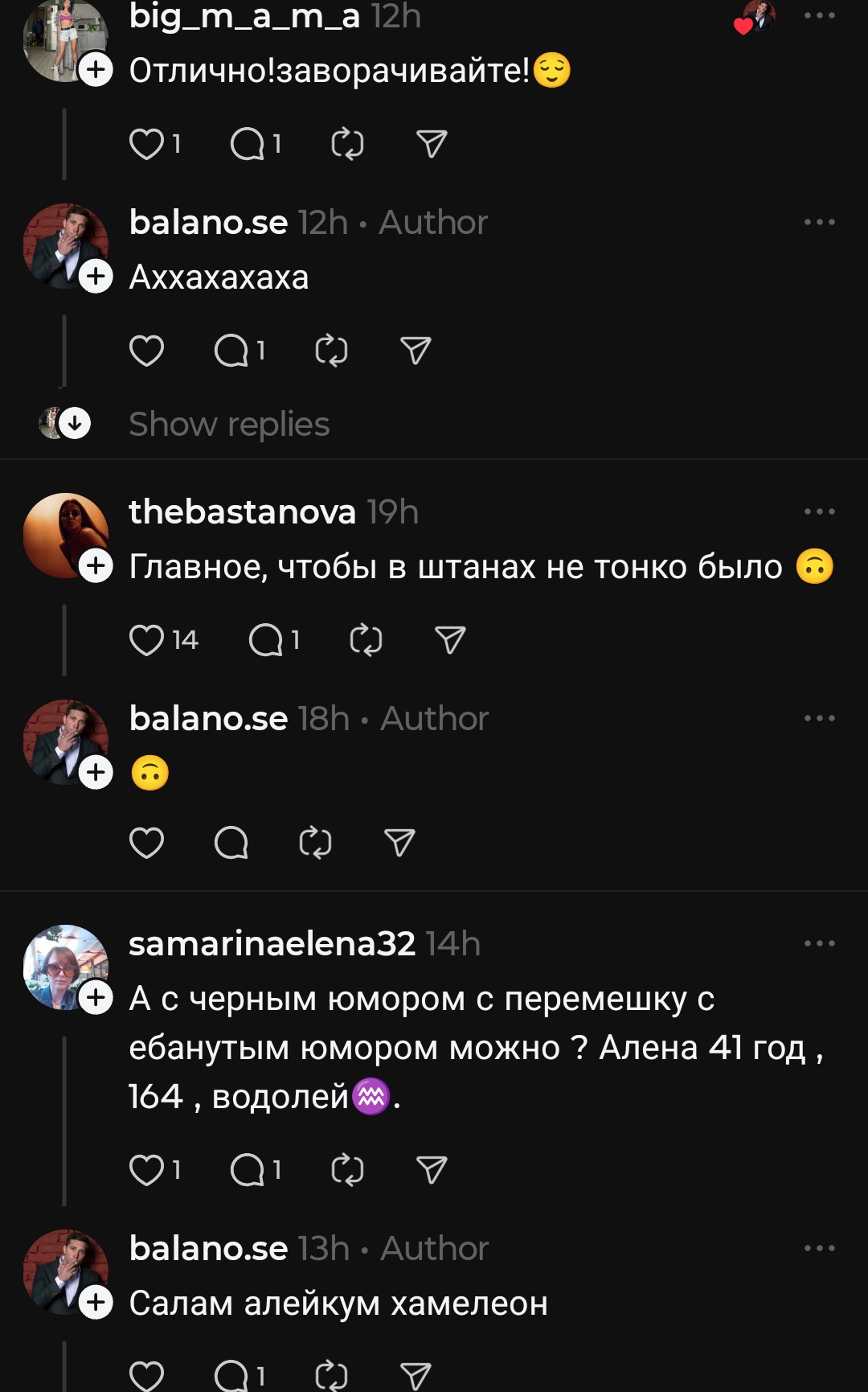 >>10423084 >И где же мои лайки? Ну вот в предыдущем треде (а может и в этом, поищи его пост) какой то жирный тролляка свой рост 182 указал и ему лайки шли и писали первым. Пробуй. К