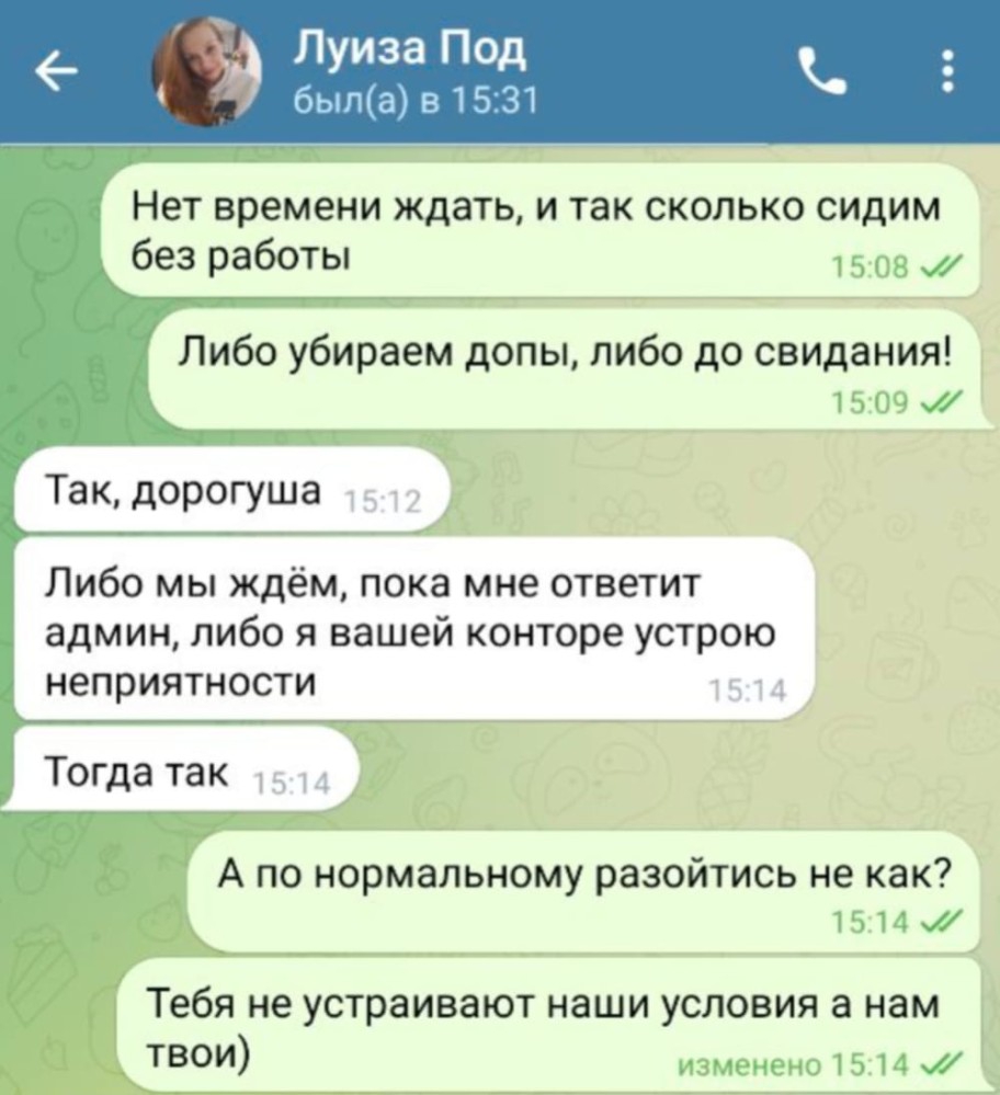 >>10422827 Ну сначала что я пиздабол и не был у нее. И ватсап написывала. Все как обычно. И не вводи в заблуждении гостей(клиентов). Причем все по факту написал, что курит, про возраст. Заебывала я ей мол уточни все у нее. Она когда все выяснила ответила что у девочки были проблемы удали милый) нехуя себе я полную стоимость оплатить а получил лишь половину услуг. Акаунт у меня старый был. Ебанул на все 3 ее анкеты. У как же потом у нее анкеты без отзывов висели вангую мне поверили а не всяким васянам которые начали ходить втом году и оценки липовые ставить. Через месяц все анкеты снесли. Мб она завязала хз.