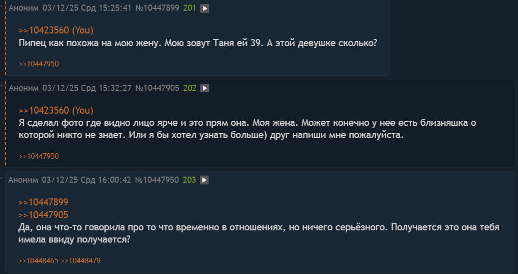 >>10423560 Я сделал фото где видно лицо ярче и это прям она. Моя жена. Может конечно у нее есть близняшка о которой никто не знает. Или я бы хотел узнать больше) друг напиши мне пожалуйста.