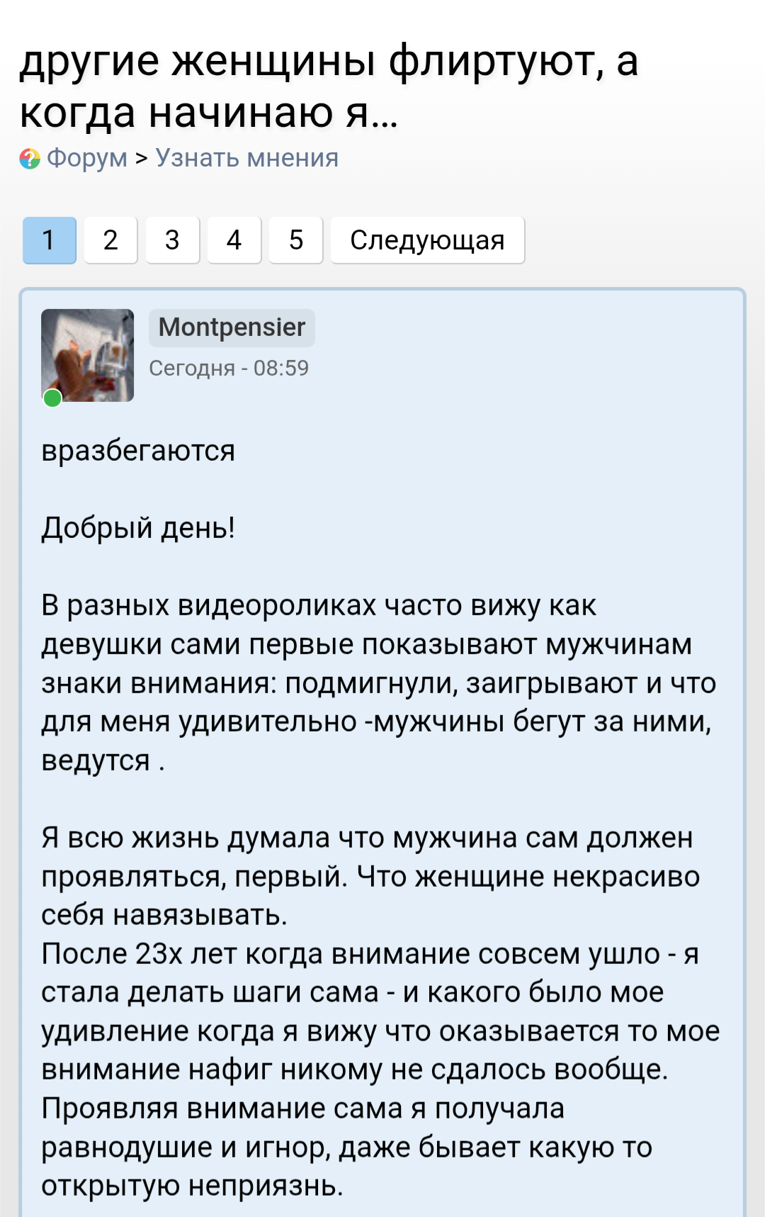 >>10424745 >ваша проблема все-таки не во внешке Во внешке, а точнее в лице. У меня на сз фото тела в одежде без лица, лайки ставят девушки, мэтчи бывают, ну и конечно потом, в переписке, они просят фото лица. Как думаешь когда они перестают со мной общаться, правильно! когда видят моё всратое ебло