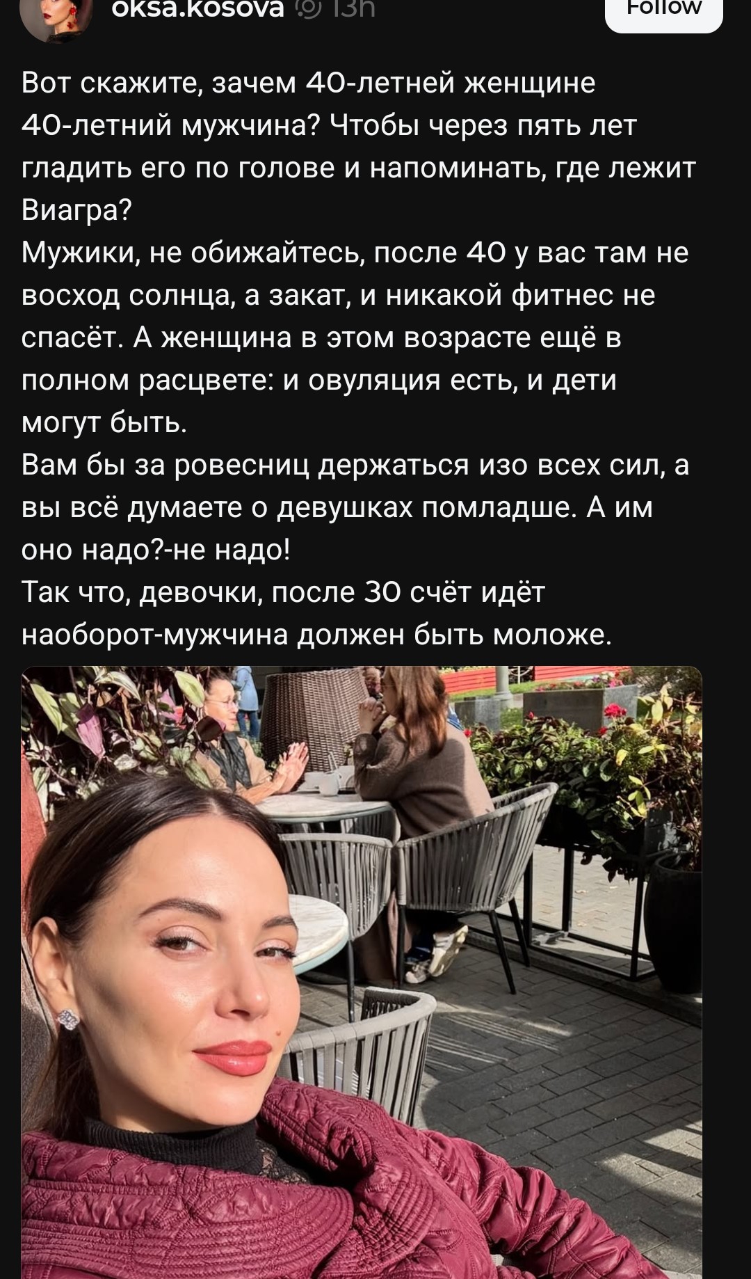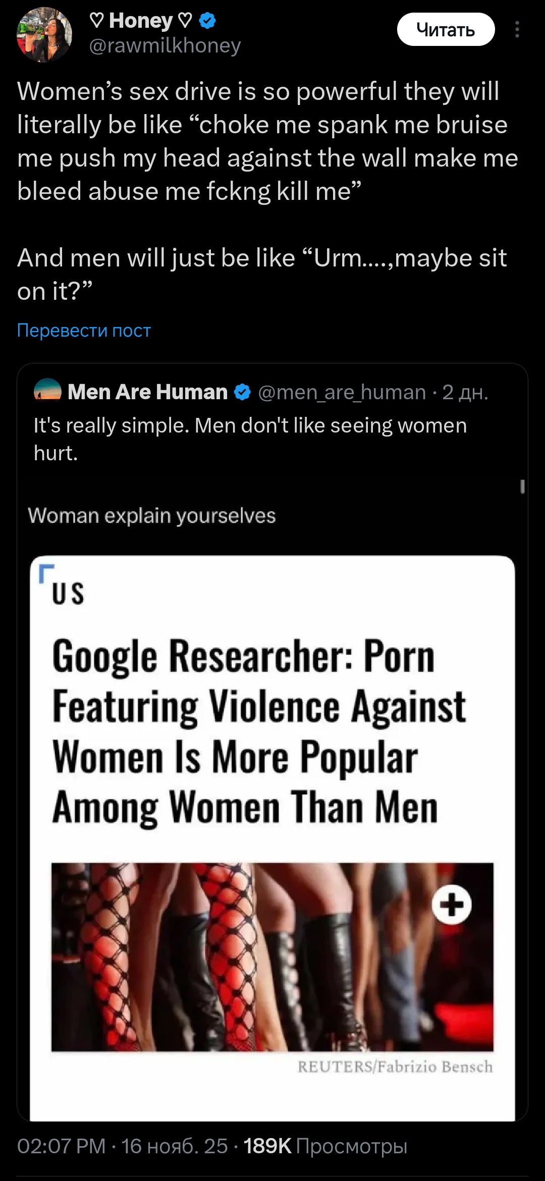 >>10426198 >Даст только секс на пару раз Всего лишь, эх...То ли дело "здоровые отношения", которых нынче днём с огнём не сыщешь, даже если ты вполне привлекательный парень. А уж обычному, среднему мужичку их в принципе не построить, потому что ценность такого в женском мире крайне низка, а значит, беречь и ценить такие отношения никто не будет.