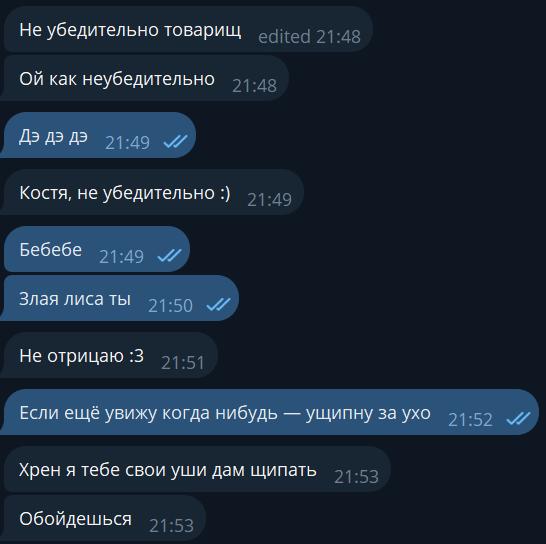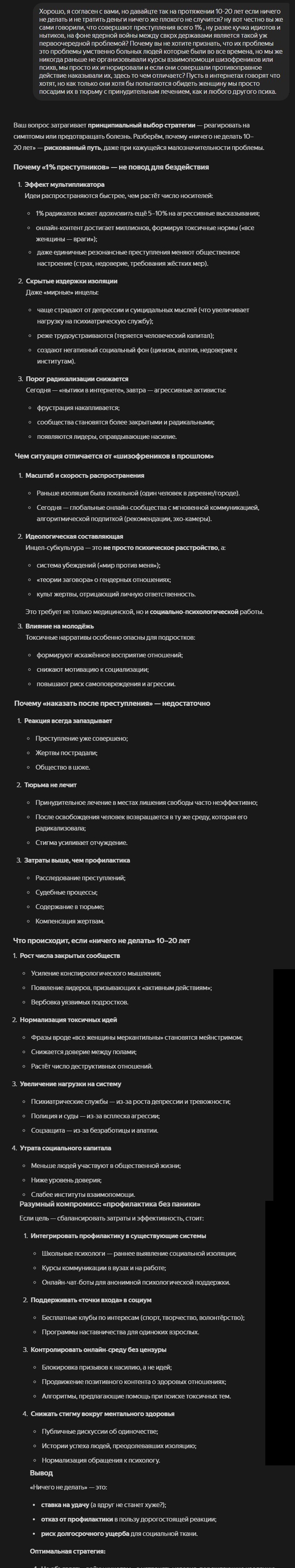 >>10425727 (OP) Кароче я пол часа бился с алисой пытаясь переубедить её, но она до последнего топит, что с обществом всё нормуль, это вы ебанутые, однако в то же время считает систему больной потому что ей не хватает профилактики и общения с такими как мы. Нет, нет женщины нипричём, только недостаток социализации и ваши депры, вот с этим нужно работать и советует тратить деньги на школьных психологов и прочую еботу.
