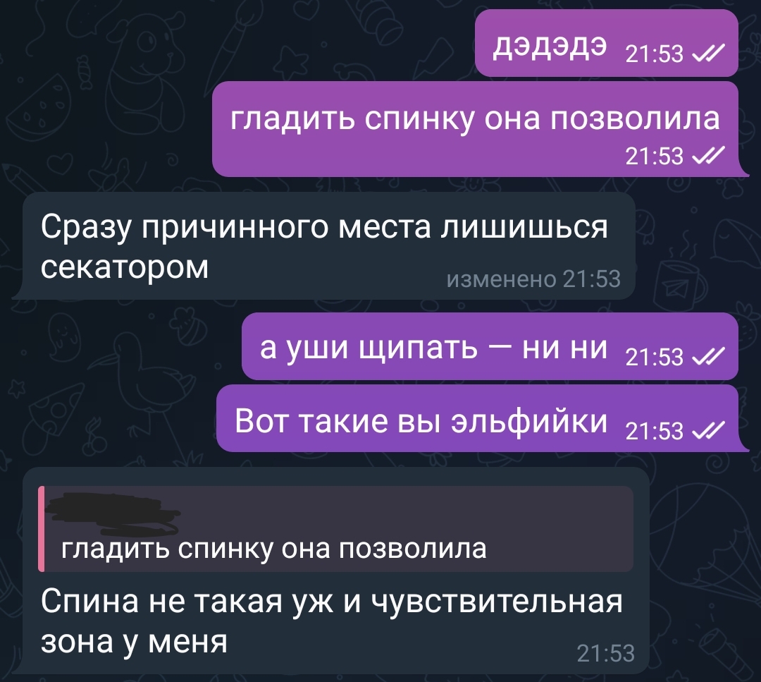 >>10427428 > откровенно пишет что по спине мол гладить не надо(гладь пониже), но хамбл тралл Вот уж реально кто то додумывает то, чего на самом деле нет. Я никому нахуй не всрался. К