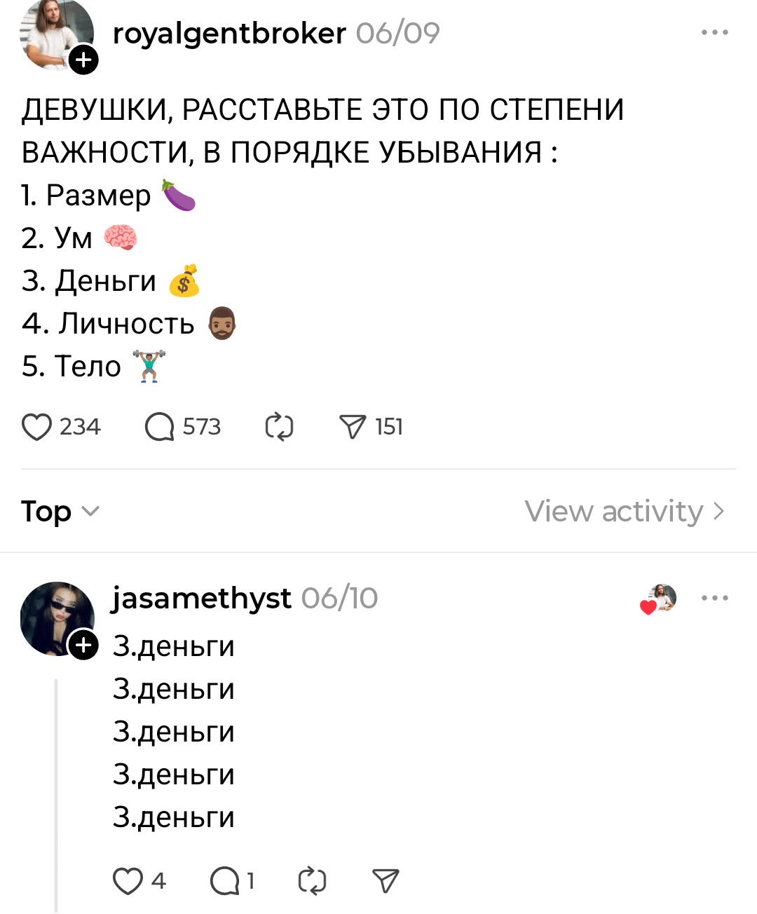 >>10427515 Если бы она хотела, уже бы поебались. >>10427514 Бариста этот тейк разъёбывает — будучи небогатой, на по сути доработке, не хотела чтобы я её подвозил, не хотела сходить даже в ссаный мак за мой счёт. Платила за себя в тот раз когда таки сходили куда то. Деньги не роляют без ростика. К
