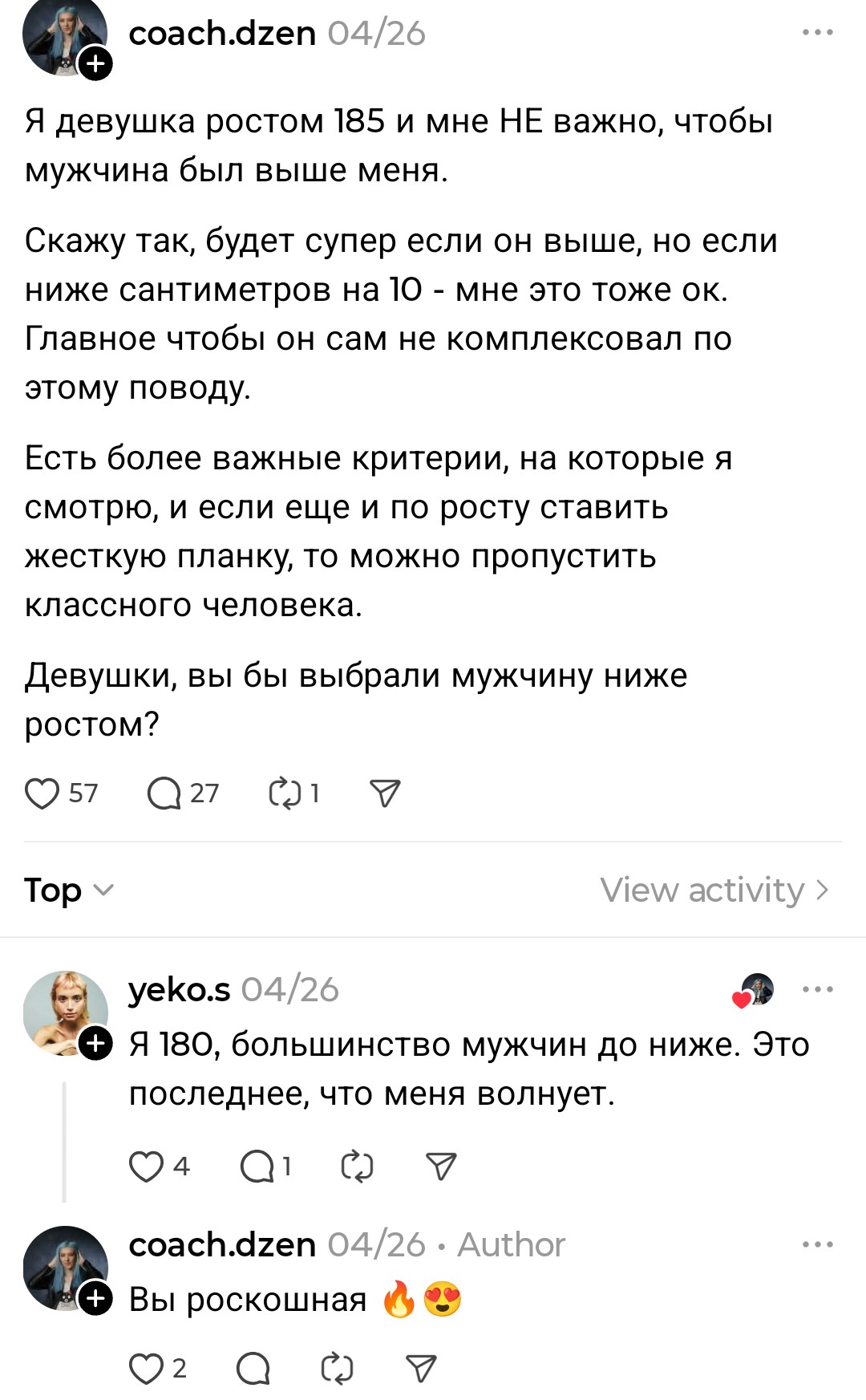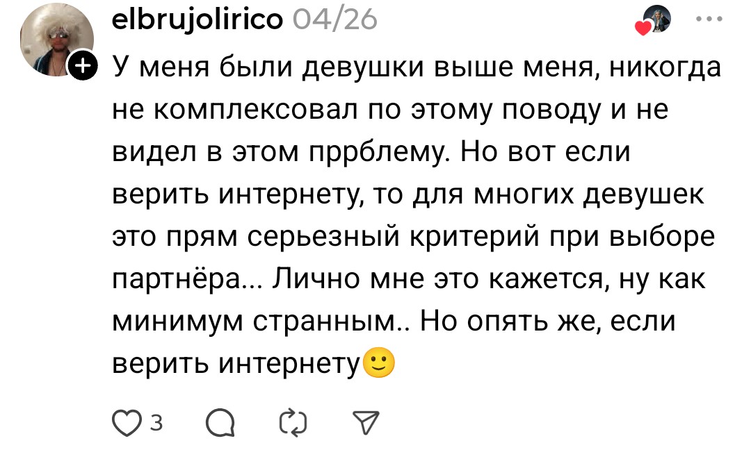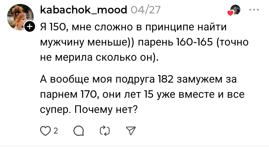 "Когда-то ухаживал парень моего роста - 158 см. И таких истерик я даже не видела, любую шутку вызывало агрессию и он лез драться. Сводил в ресторан – я! Для тебя! А ты! Неблагодарная! А потом однажды приехал через всю страну, чтобы сказать, что у него есть девушка и на самом деле я ему никогда не нравилась. Поэтому я выбрала высокого, уверенного в себе и с бешеной харизмой. И хорошей работой, кстати)"