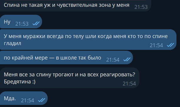 >>10427461 Но ты всё равно идиот. Почему ты так отвечаешь, будто хочешь ее слить, а не выебать? Не судьба на флирт флиртом отвечать? Почему ты не написал "Интересно, надо будет проверить, есть ли у тебя сейчас такая реакция когда спину гладят ;)" а вместо этого пишешь "Это бред"