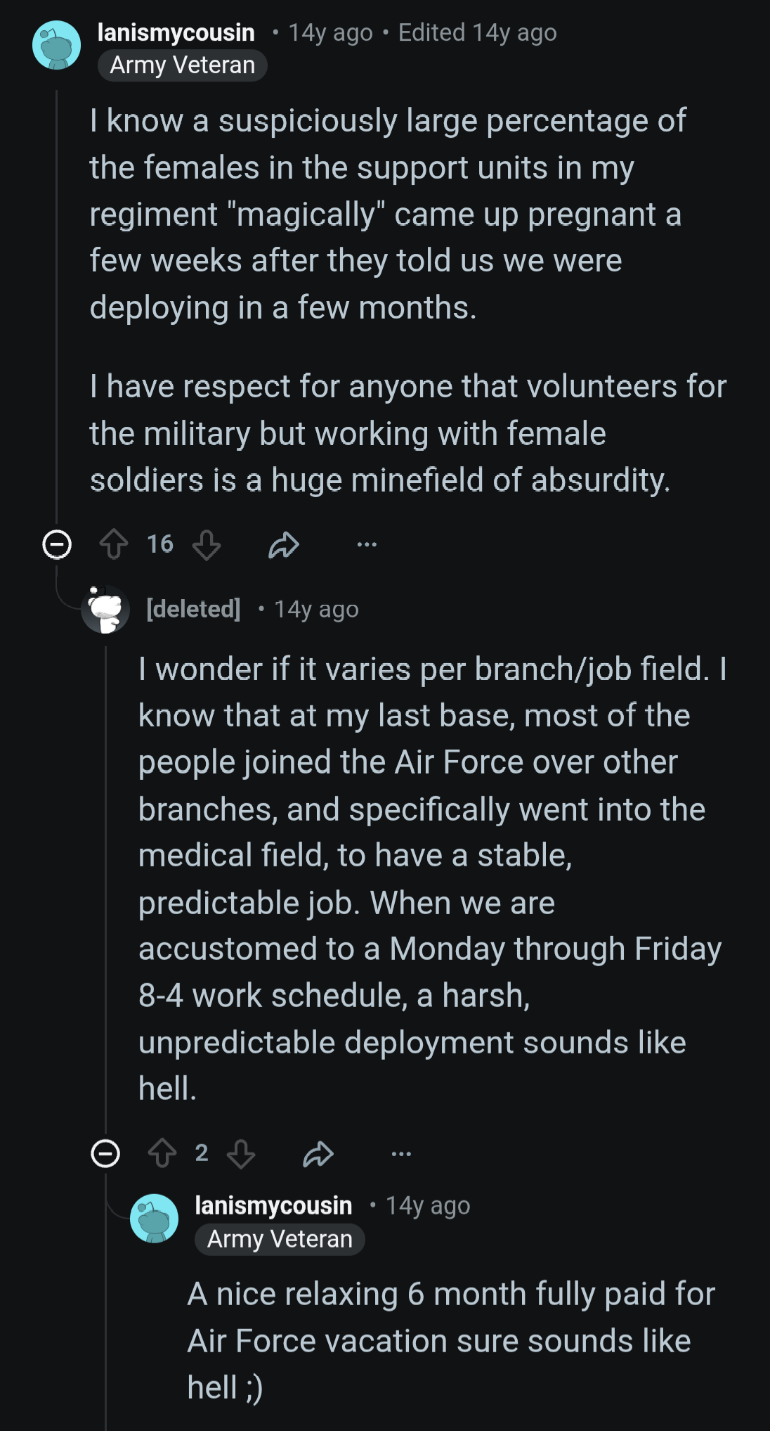 По теме. Так же женщины вояки неожиданно для всех беременеют перед отправкой в перди. Это конечно на пол уровня выше чем женитьба но лучше чем превращение в фарш ЛОЛ.