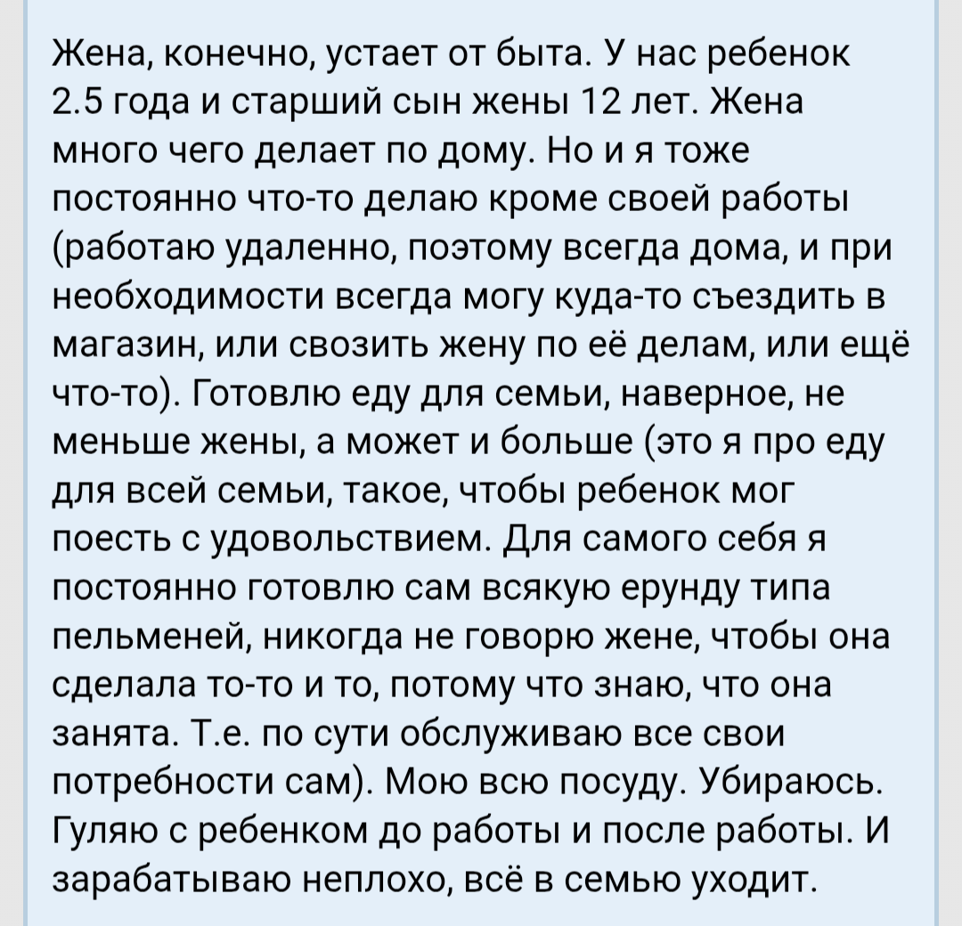В современном мире: Мужчина живет один или с мамой, не занимается собой, работает на минималку или не работает, бухает, играет на компьютере, абьюзит, срёт в комментах и поэтому никому не нужен для отношений. Женщина вкладывается в свое развитие, внешний вид, работает с психологом, в спортзале, имеет хобби, зарабатывает на двух работах, ведет соцсети, еще и воспитывает детей одна и так же никому не нужна для серьезных отношений. Жалко женщин.