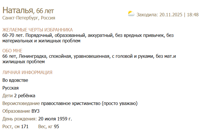 >>10430550 Процентов 60 - равны или выше 170 Причем, от возраста не зависит. Даже бабушки 175 есть Получается, что у низкого мужчины выбора не так уж и много