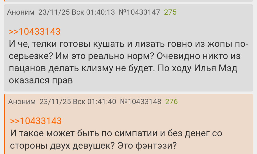 >>10433143 И че, телки готовы кушать и лизать говно из жопы по-серьезке? Им это реально норм? Очевидно никто из пацанов делать клизму не будет. По ходу Илья Мэд оказался прав