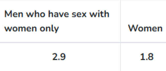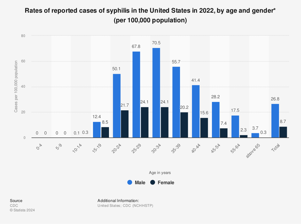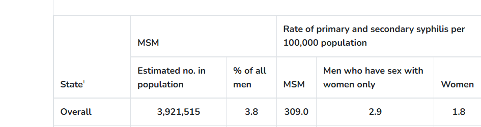 >>10434178 Не в 2, а полтора. Напомню, твой изначальный тейк был про разницу в 10 раз. Эта минимальная разница легко объясняется: 1 Мужчины реже использубт презервативы 2 Мужчины реже обращаются к врачам 3 Мужчины чаще употребляют вещества 4 Мужчины в гораздо больших количествах являются бездомными, сидят в тюрьме или обитают в пртонах.