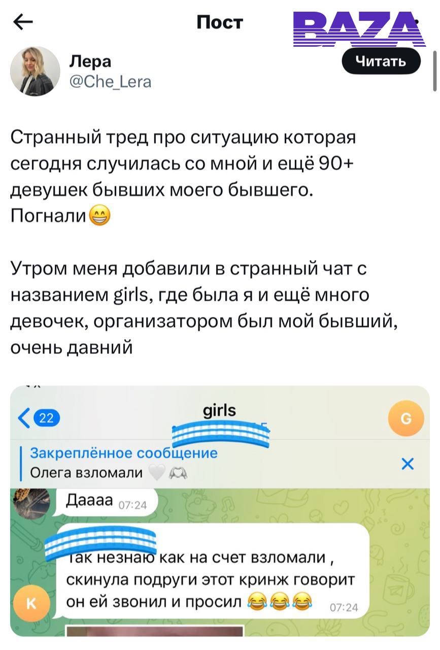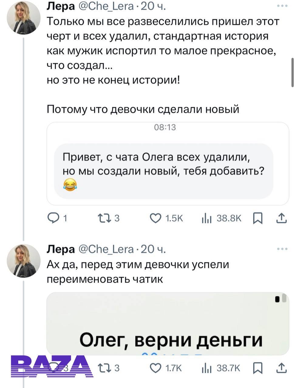 Олег создал чат «girls» («девочки»), где вскоре себя обнаружили все девушки, кто когда-то с ним встречался. Зачем он это сделал, неизвестно. Но все его бывшие довольно быстро определили причинно-следственную связь, нашли общий язык и начали обсуждать все «трещинки» Олега. Когда он понял, что натворил, то удалил чат. Но бывшим так понравился чат, что они нашли друг друга и создали новый, который назвали — «Олег, верни деньги».