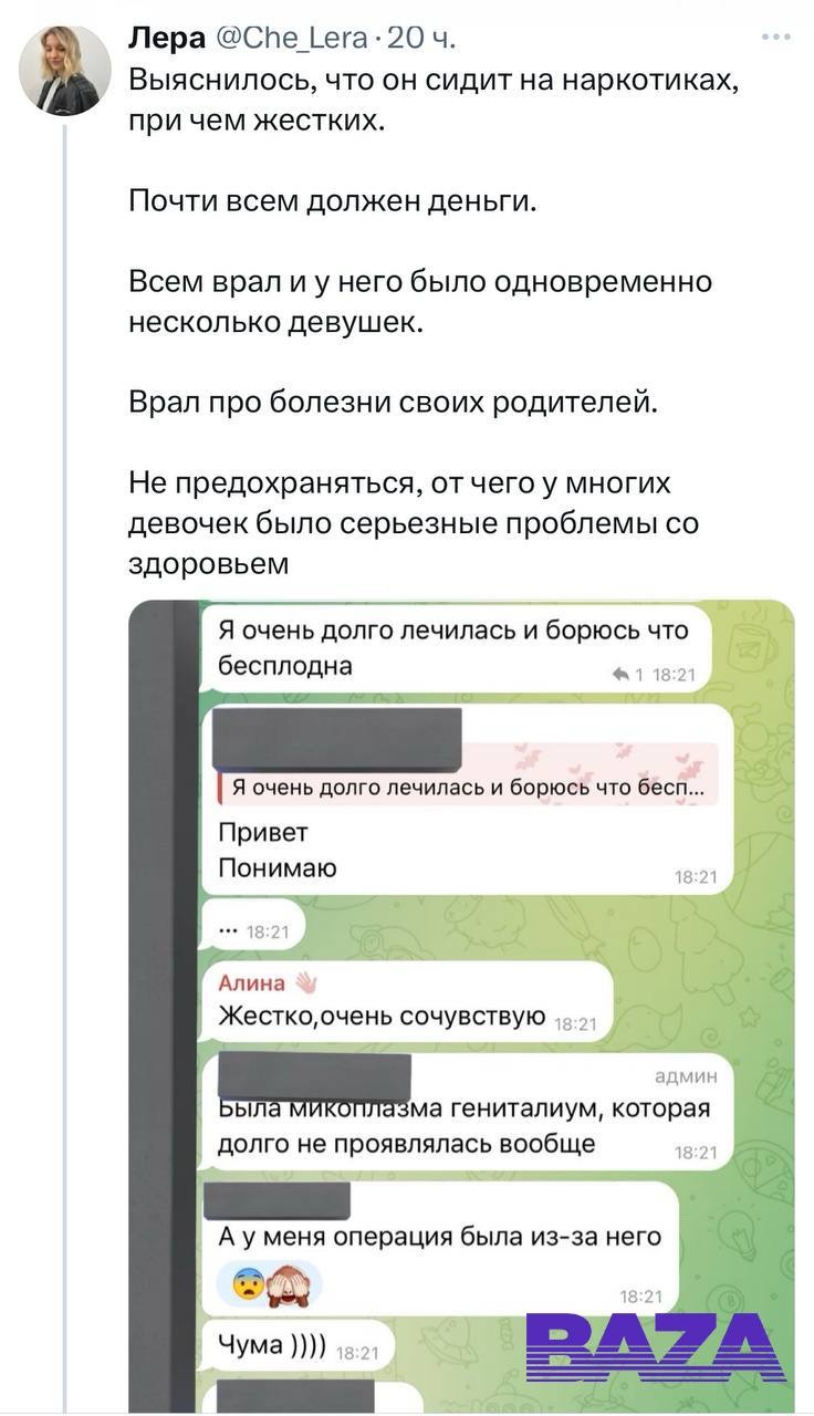 — Олег занимал деньги у всех бывших, но не вернул никому. — Встречался с несколькими девушками параллельно. — Постоянно принимал наркотики. — Не предохранялся во время секса и теперь часть девушек лечат бесплодие из-за перенесенных венерических заболеваний. — Кстати, занимался сексом Олег, по общему мнению бывших, так себе…