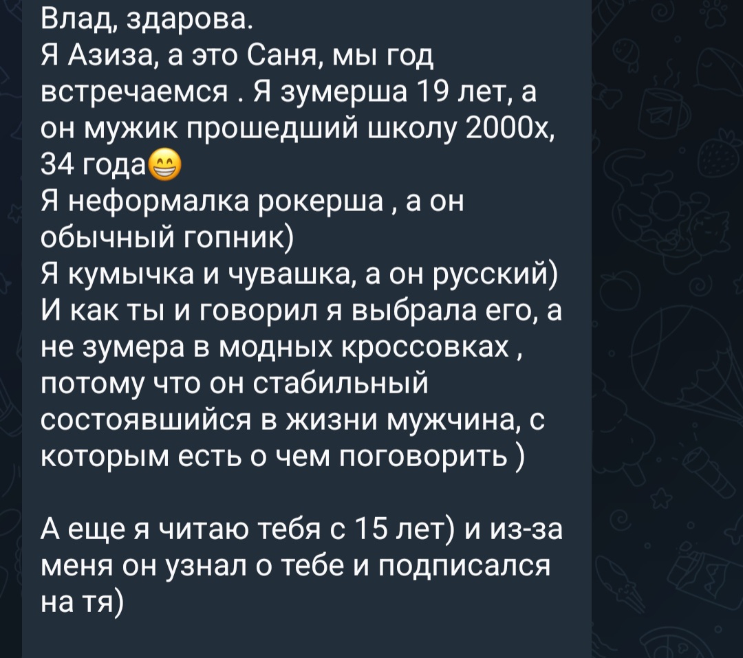 Вчера заходил в магаз, а рядом пункт выдачи Wildberries, ну там тян точку закрывала., А на улице её ждал типичный Димасик худощавого телосложения, старше её лет на пять. Какие же тянки дуры ебаные, это чмо пользуется ей и выкинет на хуй, даже замуж не позовёт. Она ведь даже этого не осознает, а потом будет искать настоящего, того самого мужчину.