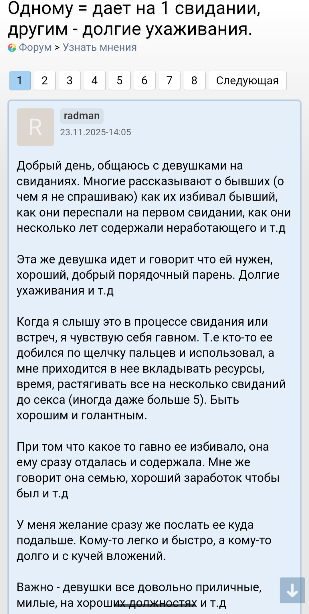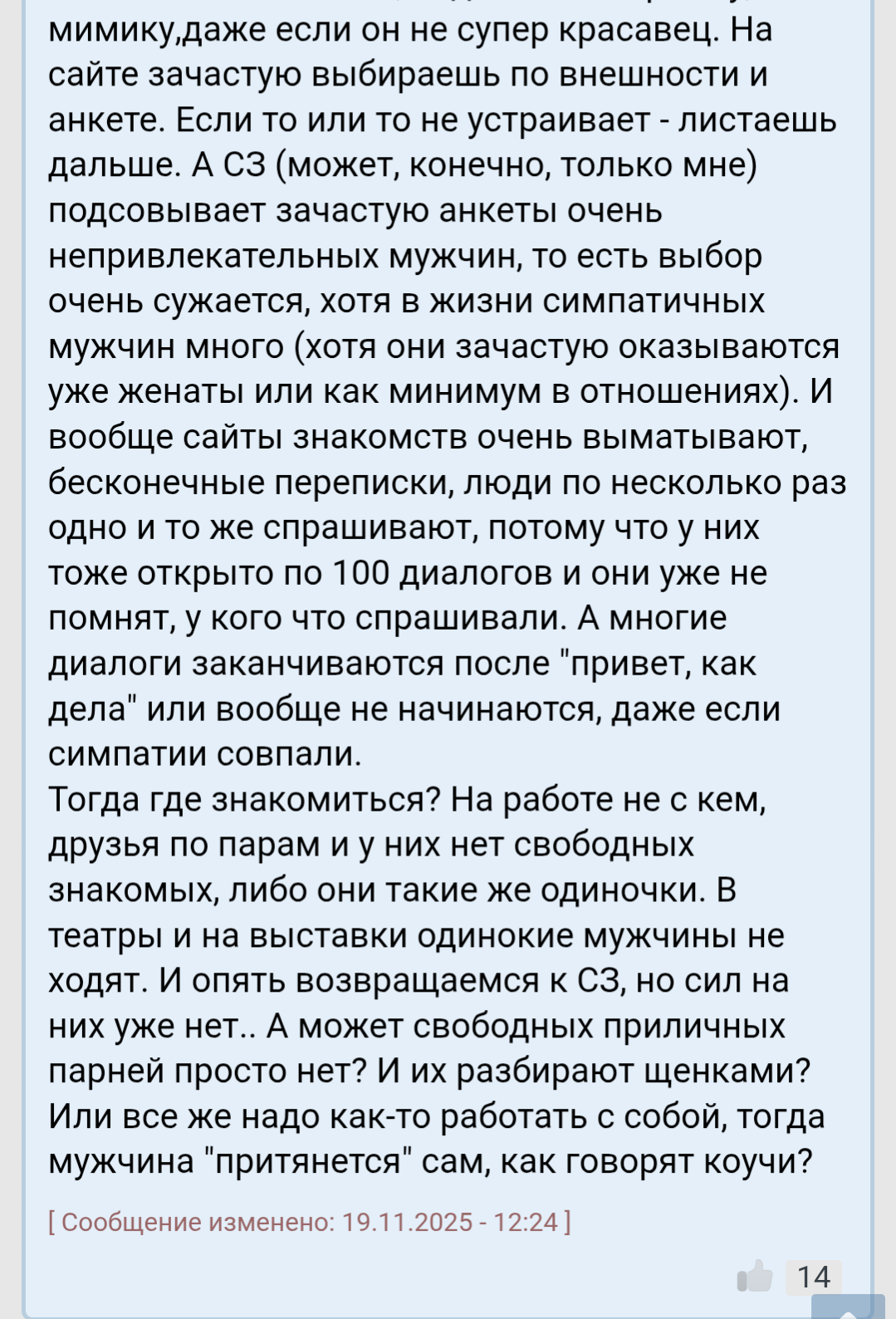 А так я, вроде, хотел или даже предлагал К создать анкету, что он ищет именно серьёзных отношений для дальнейшего заведения семьи. Хотя он писал, что детей не хочет. Возможно, после этого я отказался от идеи такое предлагать. А так прикиньте сколько на сз мычащих додиков, которые хотят просто в тян засунуть хуй. В то же время листы-романтики хотят и могут дать большее и именно то, что нужно тян. Но серьёзность намерений всяко нужно как-то проявлять в виде ухаживаний и трат, при этом К почему-то от последнего отказывается, что типа бетабакс же. Не, ну, его дело, конечно.