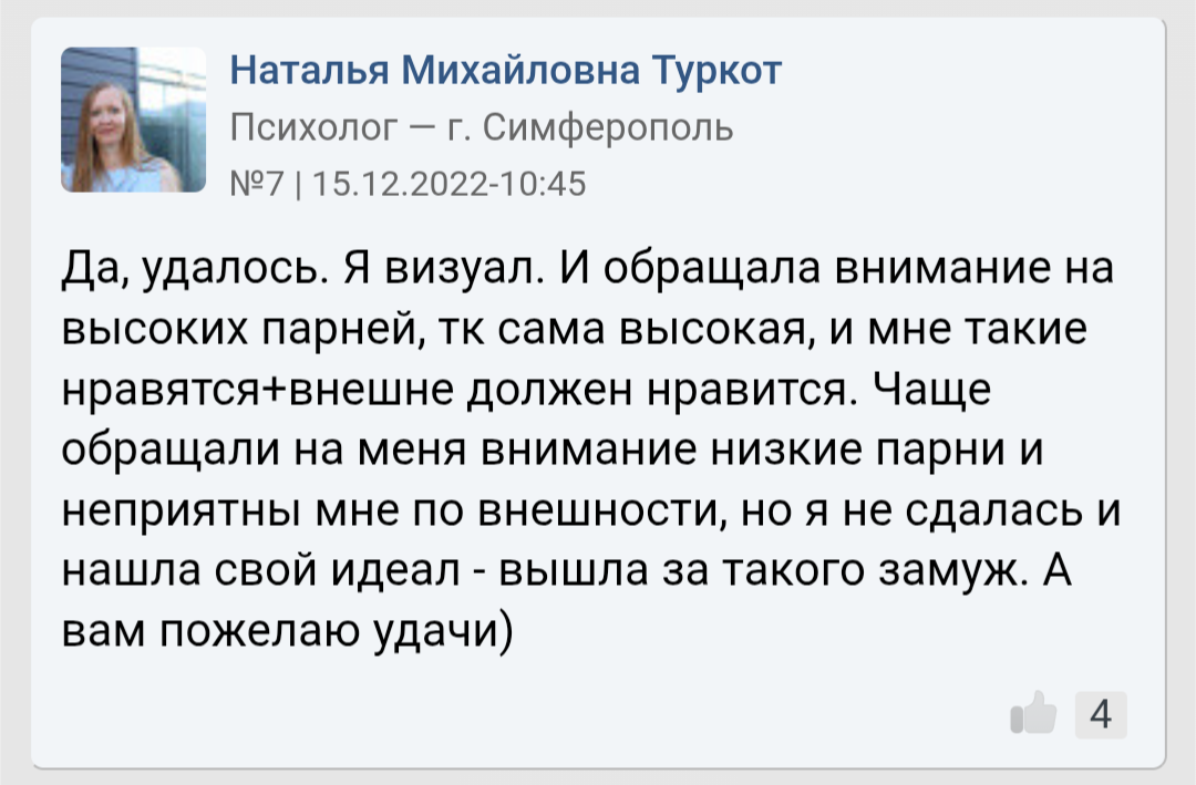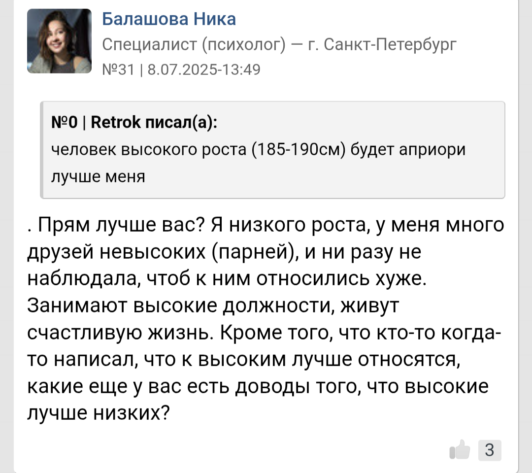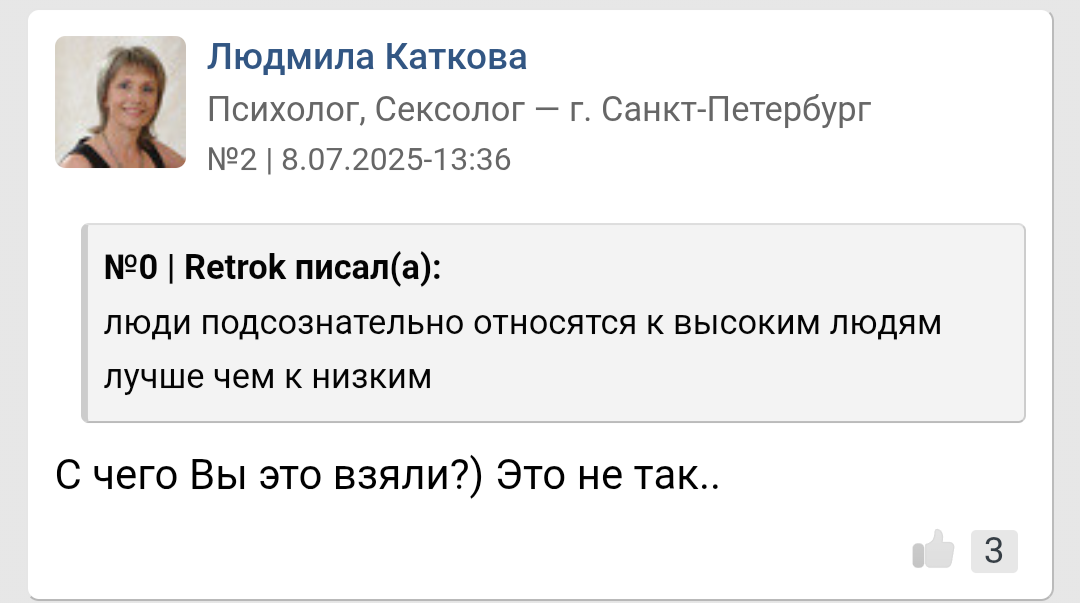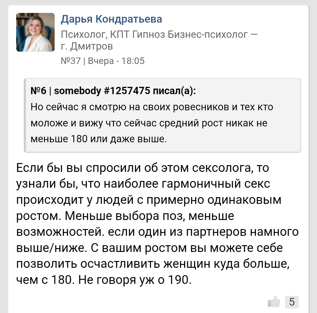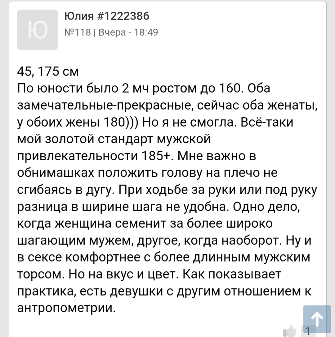 Что забавно, как только речь заходит не просто об опросе про предпочтениям, а пишет конкретный мужчина с конкретной проблемой, то психологи как будто забывают, что в соседней теме писали, что любят рослых